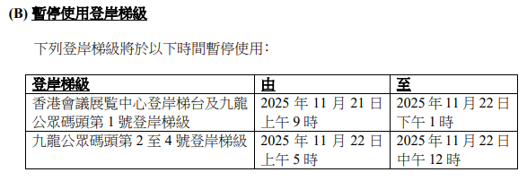 下列渡輪服務將於以下時段暫停服務,並將視乎受影響海港範圍實際重開時間而恢復服務: