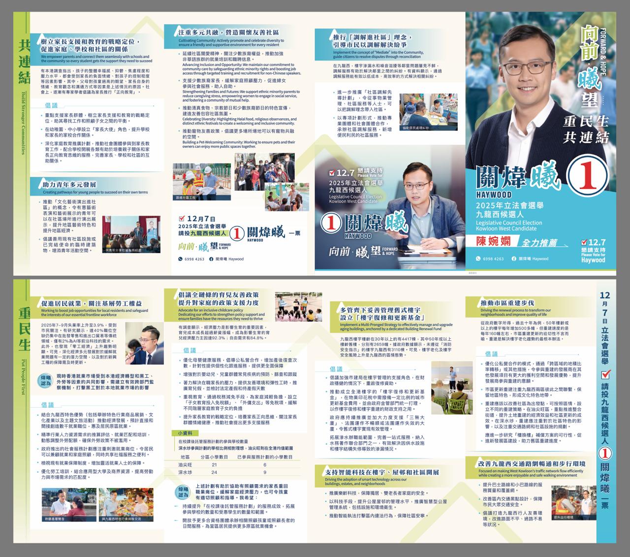 1號候選人關煒曦,現任油尖旺區議員。他致力推動結合九龍西地區傳統優勢和特色,例如促推文創產業、主題文旅活動和特色商品展銷等,創造就業職位,並以熱門景點為載體,發展特色經濟產業,推動舊油麻地警署成為地標式文創匯聚點。交通議題方面,關煒曦倡改善九龍西交通路網和步行環境,以提升九龍西的交通便利優勢,包括提升巴士路線和小巴路線的服務質量和覆蓋網,改善區內交通黑點設計,改進路面不平、過路不易等。至於青年發展方面,關煒曦倡議拓展應用型人才的課程,提升青年在職業跑道上的競爭力,善用現有社區設施或已完結的臨時建築物,增加青年活動空間,包括排演場所、供預約的共享辦公和會議室,為青年多元發展打下基礎。