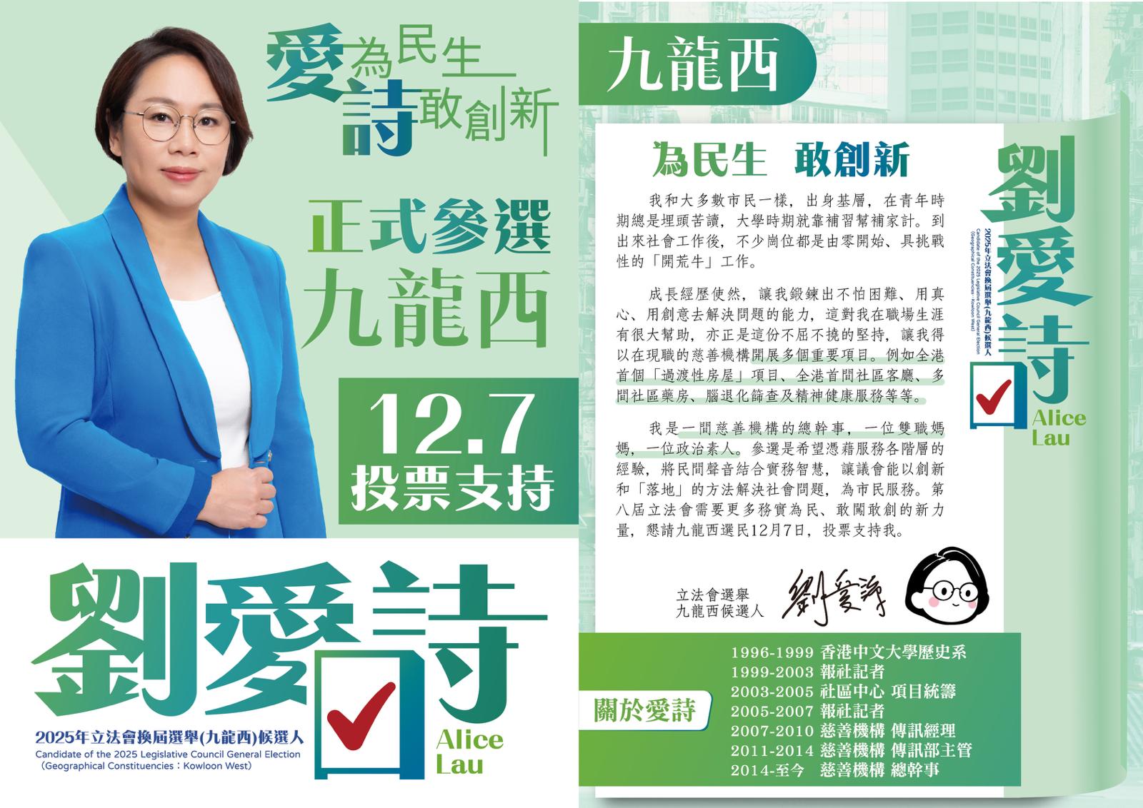 報稱慈善機構總幹事的2號候選人劉愛詩,強調年輕人是社會的未來,她主張從教育及青年發展着手,為他們找到更多可能性。她建議開發「明Teen打工仔」試驗計劃,為中小學生提供虛擬職場「體驗周」,透過實境體驗,讓學生發掘興趣同時了解社會運作,幫助他們探索路向,為未來發展定下目標。她建議,逐步強化「職學雙軌」發展,如善用應用科學大學為年輕人鋪設跑道,設計能配合年輕人興趣及經濟發展所需技能的課程,如電商及文創產業等,幫助他們發展事業。至於年輕人的住屋問題,劉愛詩倡優化「青年宿舍計劃」,在市區設立更多青年共居空間,以相宜租金助年輕人儲蓄,同時匯聚志同道合的年輕人共同發展及建立互助網絡,讓年輕人更有條件地選擇自己的發展方向。