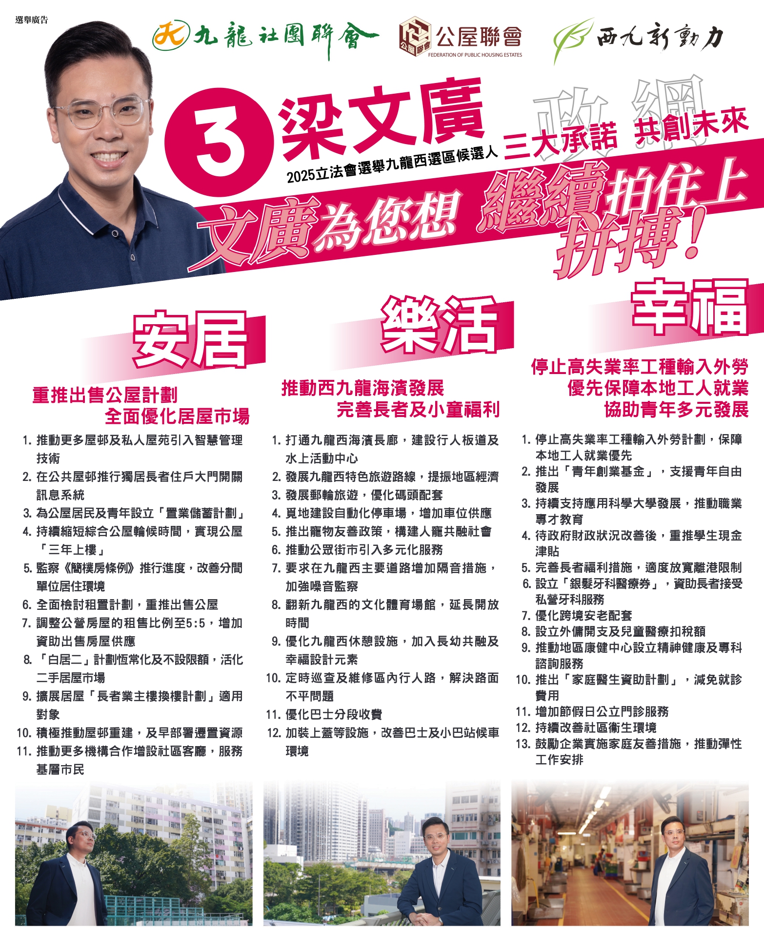 3號候選人梁文廣,為競逐連任的現任九龍西立法會議員。交通方面,他主張發展智慧交通,在西九龍高鐵站推行無人駕駛接駁服務,加強區域聯動;增設更多自動化停車場及夜間商用車位,解決「泊車難」問題。公共交通方面,他支持推動優化巴士分段收費、改善候車環境等。青年發展上,梁文廣爭取重推「夾心階層住屋計劃」、豁免首置印花稅及引入漸進式按揭,減輕青年「上車」負擔。青年發展方面,他積極協助青年創業,同時推動職專教育與產業接軌,開拓多元發展路徑;至於經濟,梁文廣倡議積極發展地區旅遊、演唱會經濟及郵輪旅遊等新型旅遊產品,同時優化街市及排檔政策,活化廟街、深水埗鴨寮街等文化地標,打造特色街區,激發社區經濟活力。