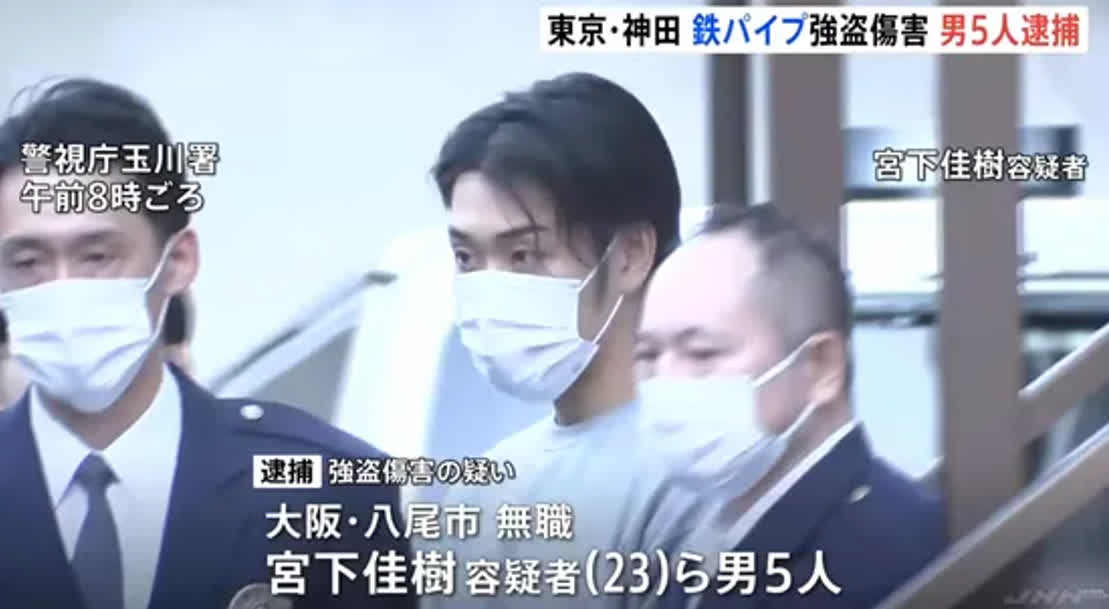 日媒公布的其中一名嫌犯名為宮下佳樹,今年23歲,當地警方稱這5名襲擊者相互認識,此次襲擊系有組織有預謀的作案。案發當天上午,其中4名襲擊者從大阪駕車來到案發地,並用噴霧裝置破壞了周邊的監控攝像頭,試圖以此逃避警方追捕。