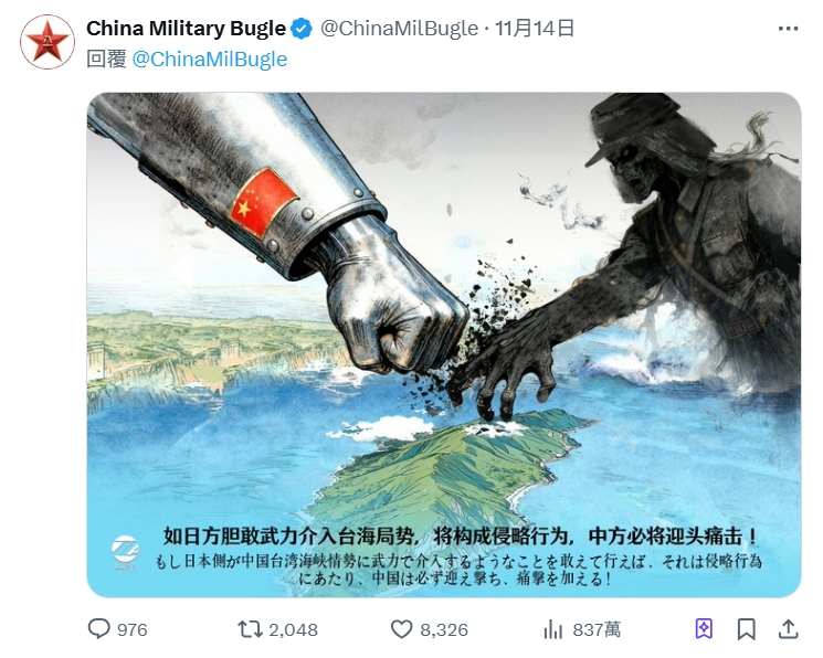 11月13日,中國軍號在社交平台發布日語海報:如日方膽敢武力介入台海局勢,中方必將迎頭痛擊;後於19日發布漫畫海報,痛批「高市早苗為日本軍國主義招魂」。