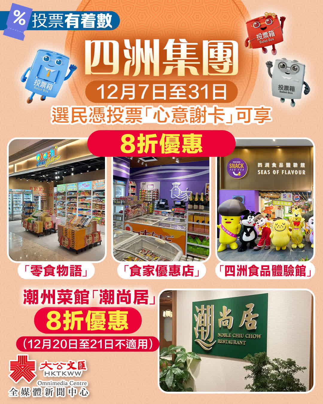 四洲集團因應於12月7日至12月31日推出投票優惠活動,顧客憑投票「心意謝卡」到集團旗下「零食物語」、「食家優惠店」及「四洲食品體驗館」等共51間零售店消費,可享8折購物優惠。集團旗下潮州菜館「潮尚居」早前亦已推出投票優惠活動,12月7日至12月31日(12月20日至21日不適用),選民憑投票「心意謝卡」到店消費可享8折優惠。