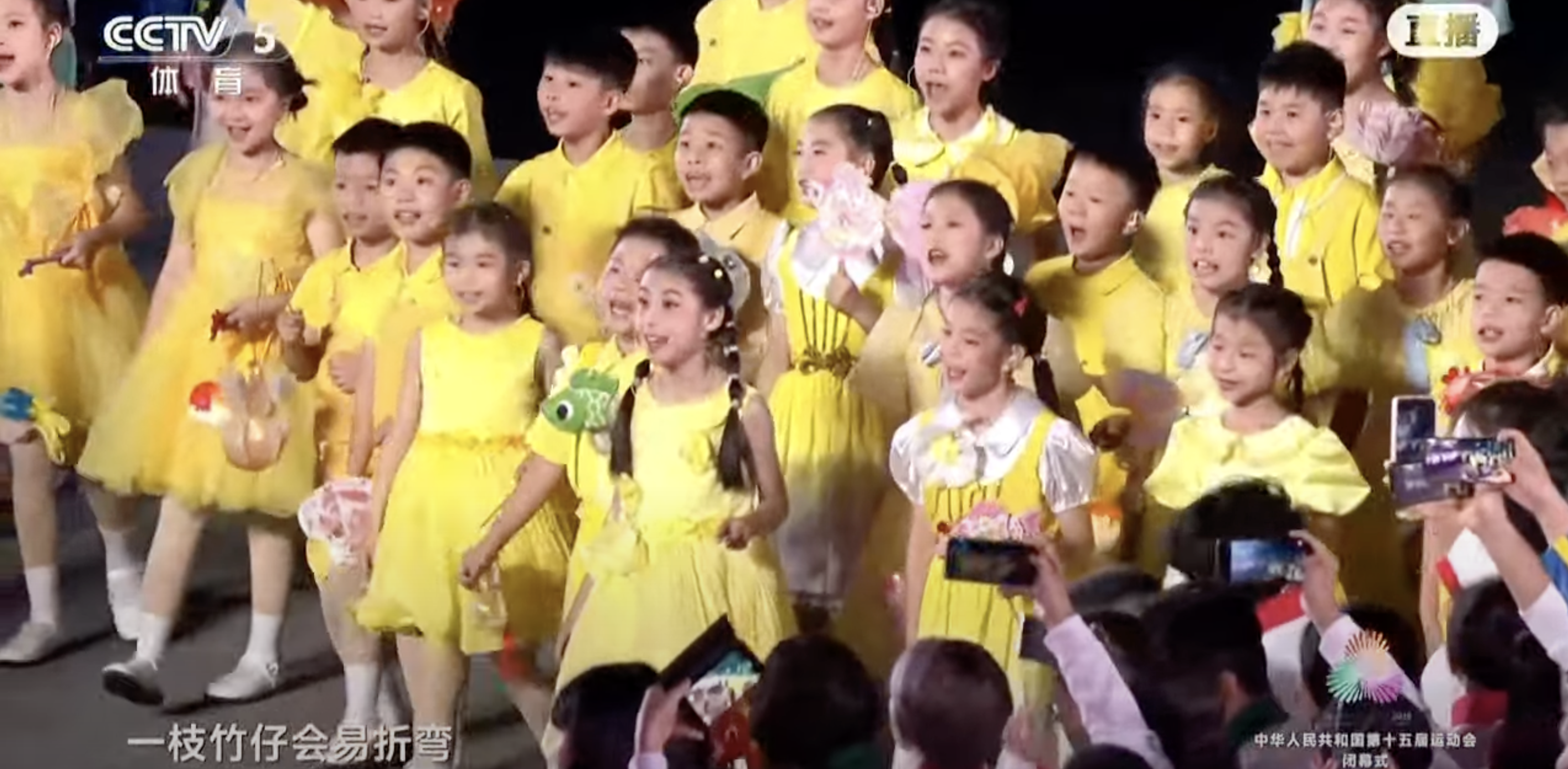 一群可愛的小表演者登台,為觀眾獻上歌曲《一枝竹仔》。這首歌由香港作曲家周聰創作,被譽為開創粵語童謠創作先河的作品之一,也是大灣區人耳熟能詳的童年回憶。其歌詞理念強調團結合作,在純淨童聲的演繹下,顯得生動而充滿童趣。