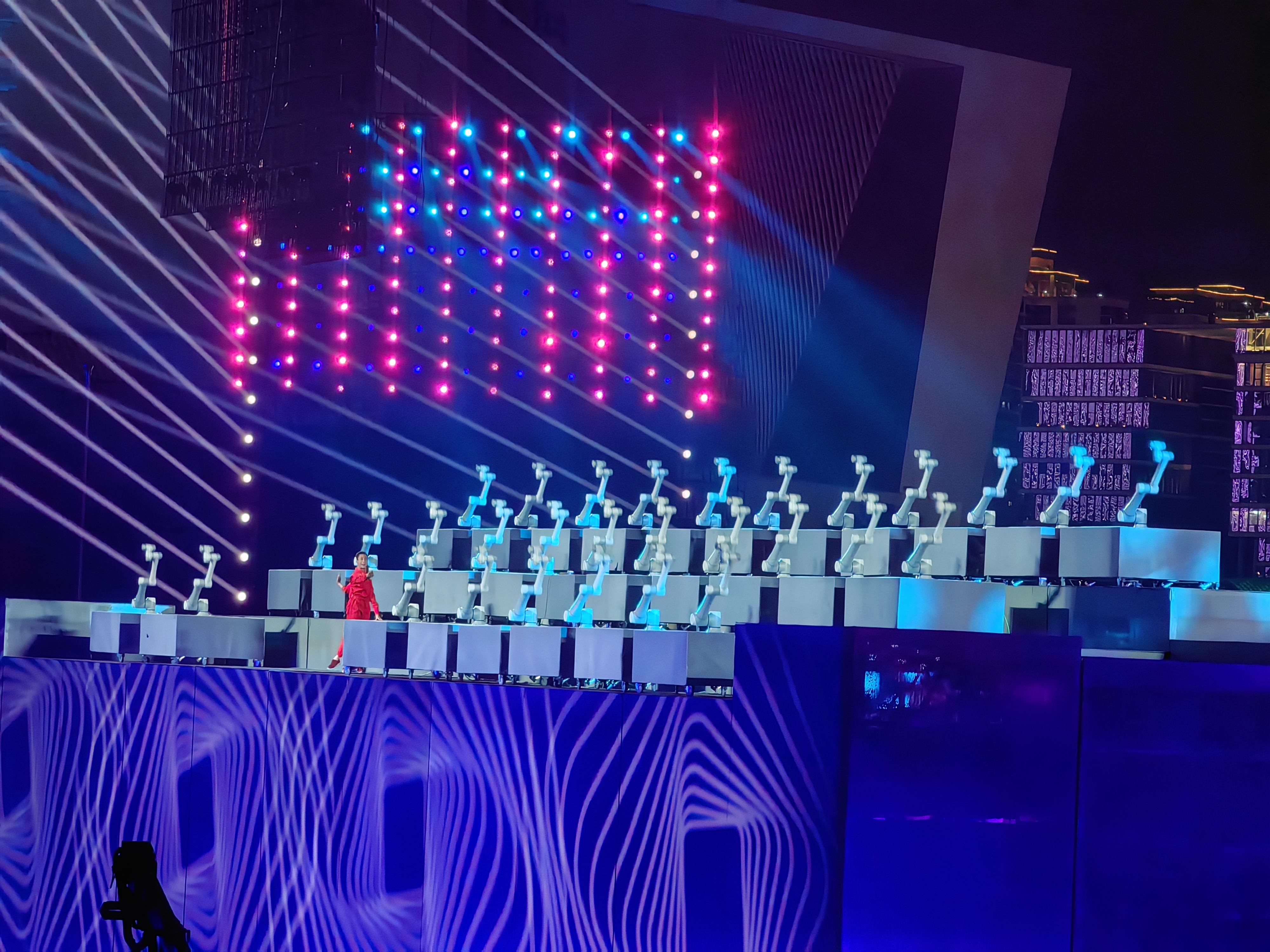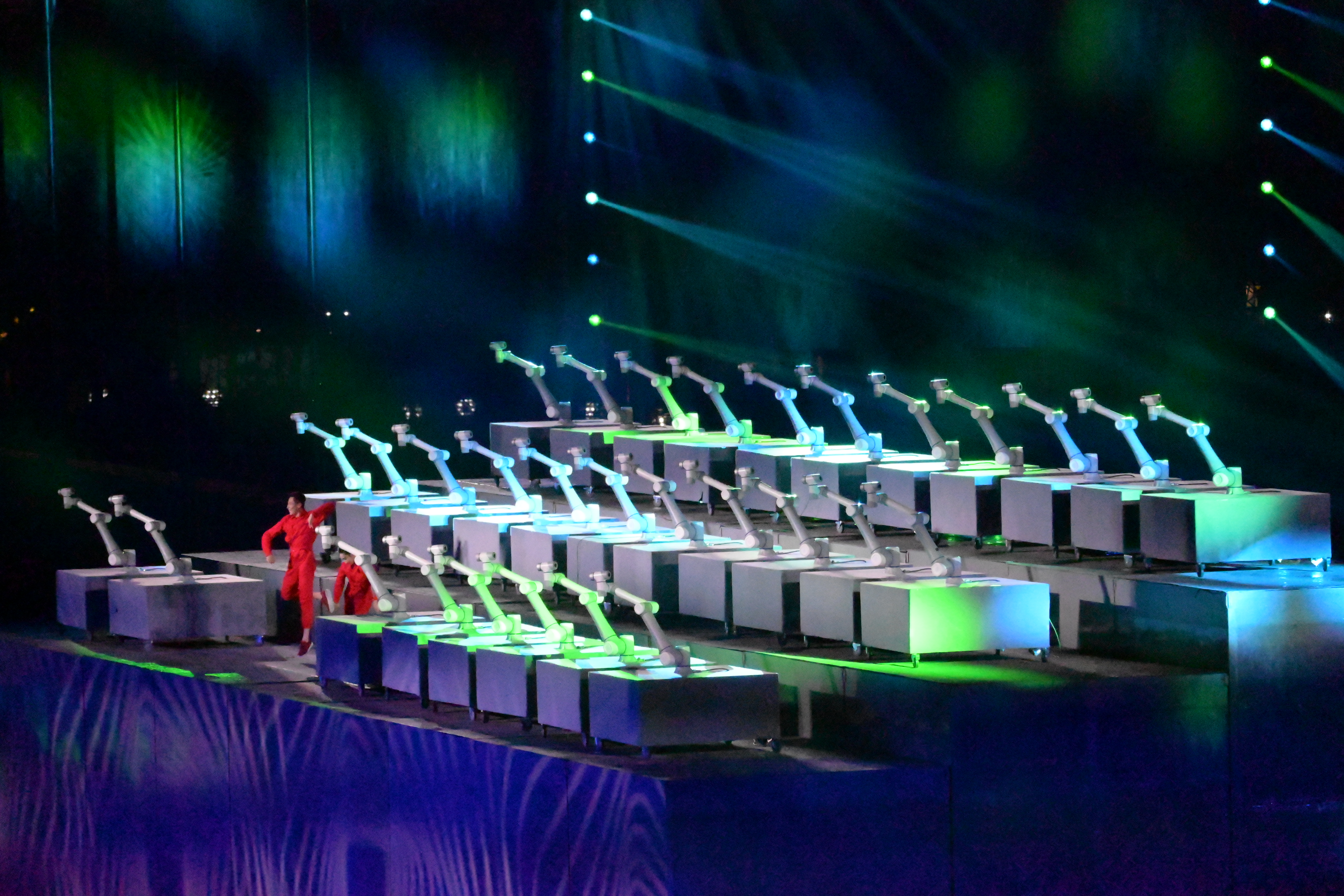 節目表演採用各類科技技術,表演者們與機械臂、機器人共同起舞,通過對高新科技場景的藝術化表現,展現科技發展與生態人文共融的時代風貌。