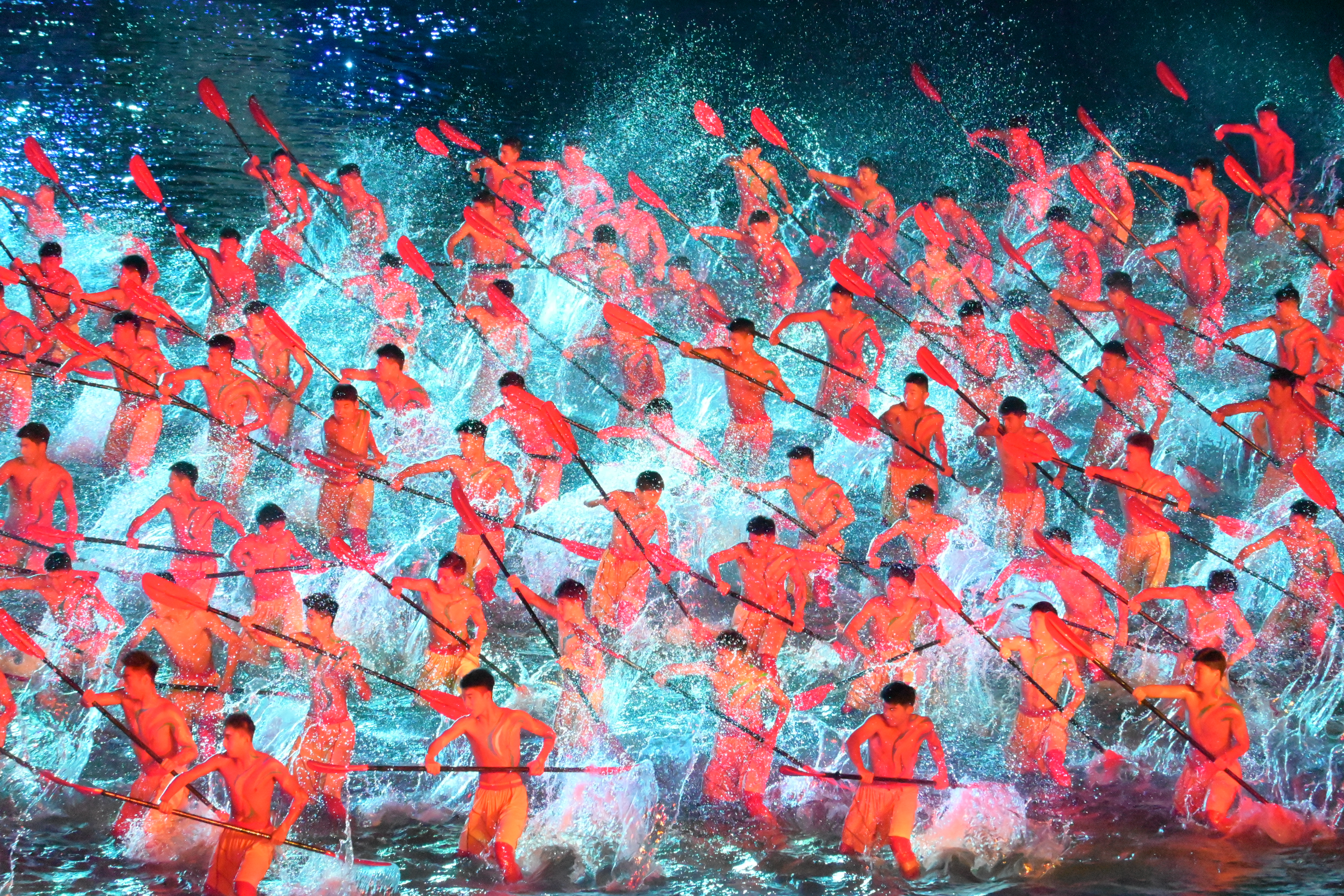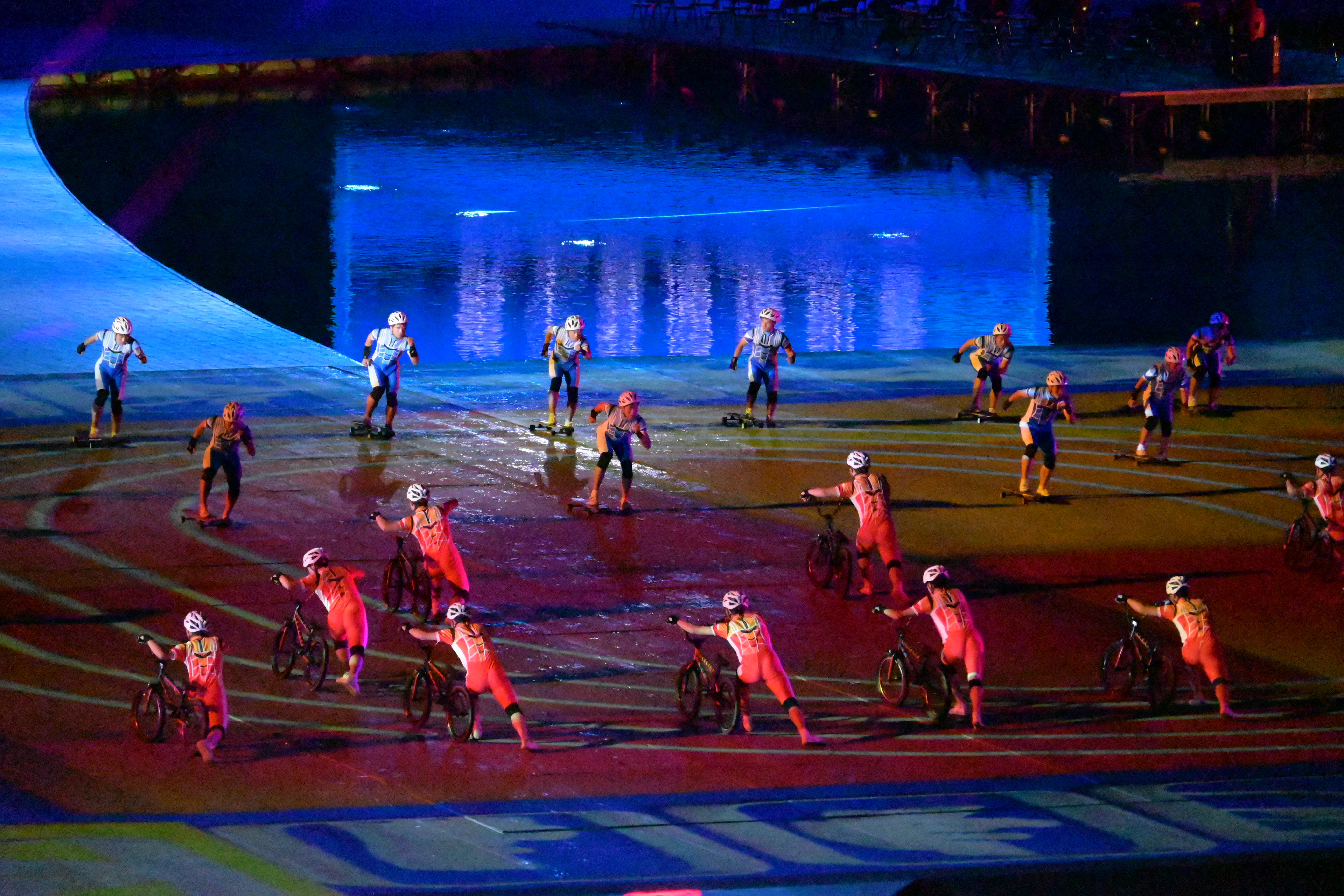 激昂的音樂中,表演者們以精湛的技巧,呈現小輪車、滑板、花樣游泳、劃龍舟等體育項目的運動集錦,展現中華體育精神的繼承創新、發揚光大!