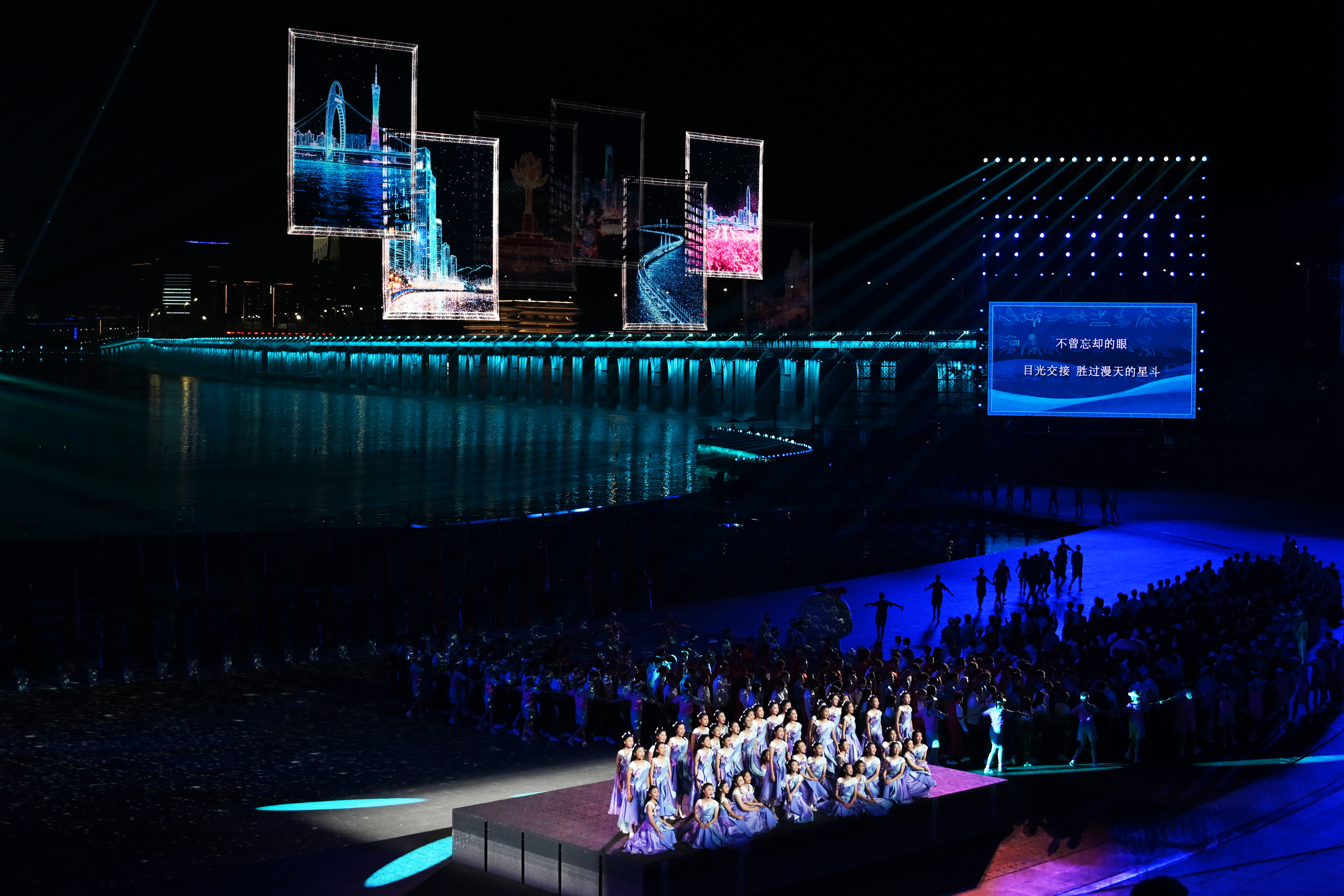 閉幕式首次採用海濱實景舞台,以「海天一色」為背景,為觀眾帶來沉浸式體驗。文藝展演《星辰大海》以《遙遠的歌謠》開篇,通過疍家民謠、改革開放經典畫面重現、科技與人文共舞等篇章,展現了嶺南文化、特區精神與大灣區創新活力。壓軸環節,全場合唱《友誼地久天長》,深情落幕。