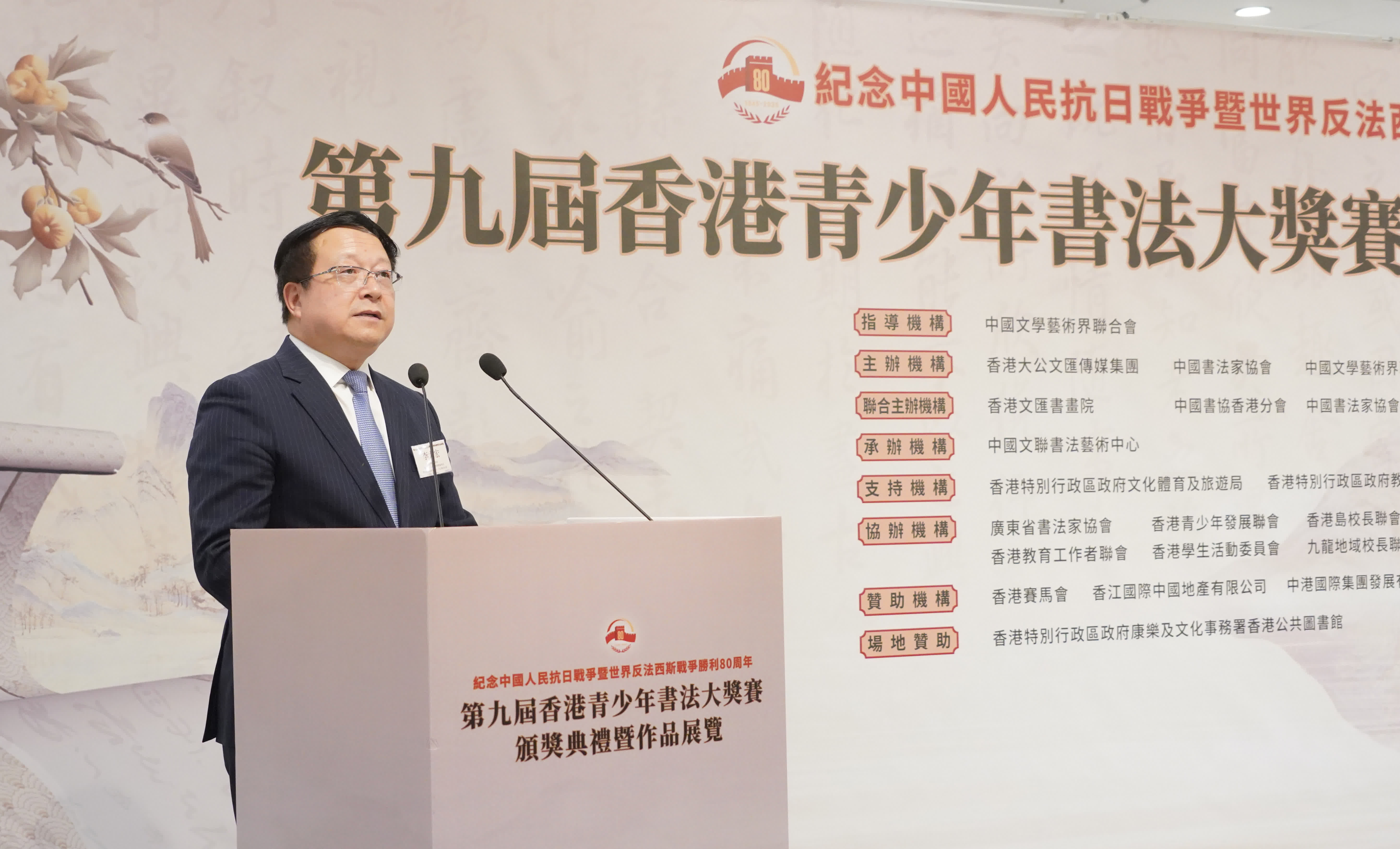 (香港文匯報 記者 楊梓穎、史柳藝)今年是中國人民抗日戰爭暨世界反法西斯戰爭勝利80周年,為鼓勵香港青少年透過書法藝術傳承中華文化,弘揚愛國精神,由中國文學藝術界聯合會作為指導單位,香港大公文匯傳媒集團、中國書法家協會、中國文學藝術界聯合會香港會員總會攜手舉辦的「第九屆香港青少年書法大獎賽」,今日(21日)在香港中央圖書館舉行頒獎典禮。今年大賽以抗戰勝利80周年為主題,吸引了全港逾290間中小學校、近8,000幅作品參賽,規模創歷屆新高,充分展現學界對書法藝術的熱情,及青少年對中華優秀傳統文化的深刻認同。為頒獎禮主禮的特區政府教育局局長蔡若蓮致辭時表示,活動讓同學重溫抗戰時期的烽火歲月,厚植家國情懷,寄語青年人要傳承中華傳統文化,為建設文化強國貢獻力量。