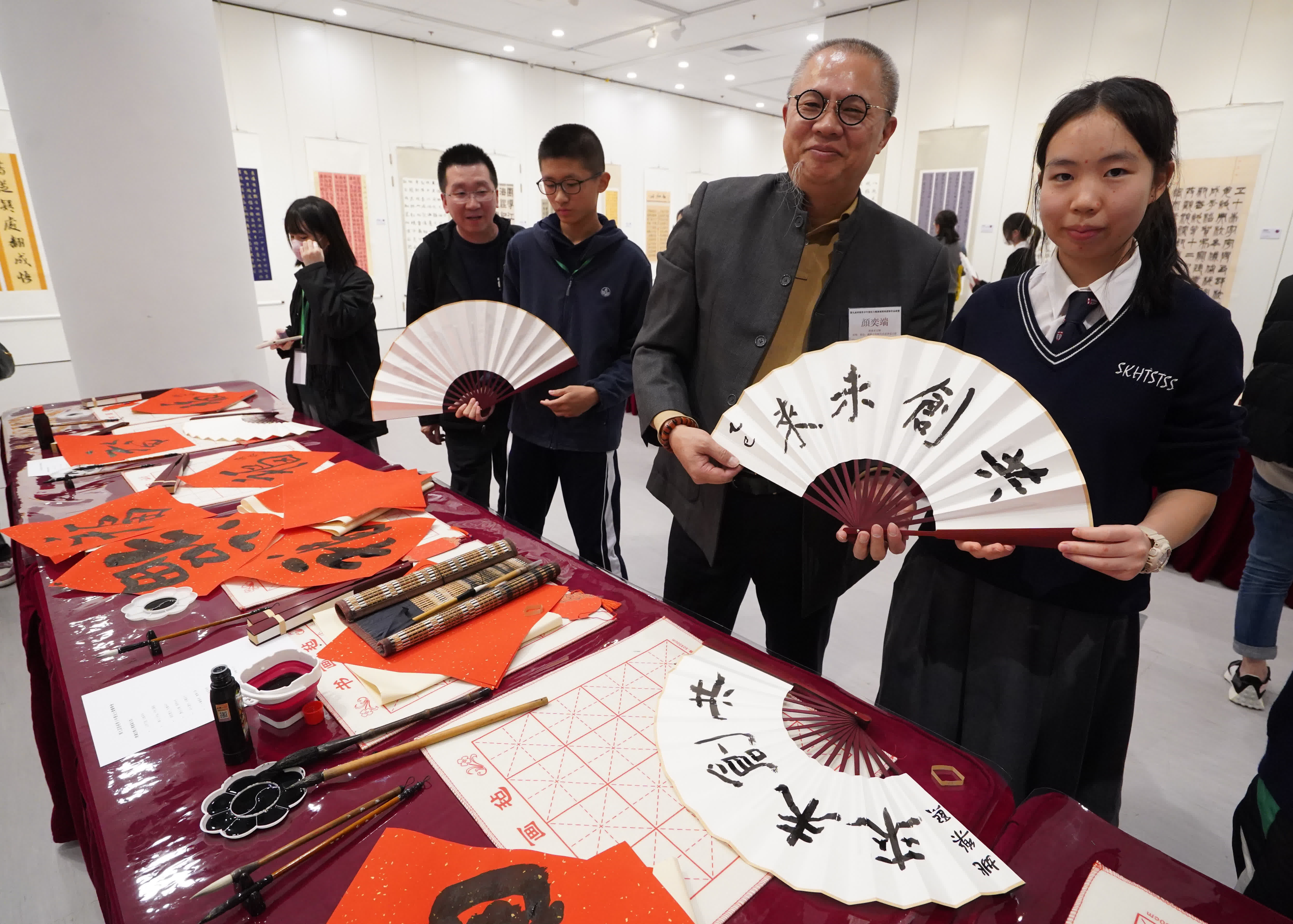 適逢12月7日立法會選舉投票日,書法名家還指導同學於扇面上創作「投入選舉,共創未來」,以藝術方式呼籲社會各界踴躍投票,履行公民責任,當中,廣東省文聯美術、書法、攝影工作部主任、省書協主席顏奕端親自指導獲得優異獎的同學姚樂熙寫毛筆字,更將其親手寫的「投入選舉,共創未來」扇子贈予同學,望同學回去多加練習,繼續努力練好毛筆字。
