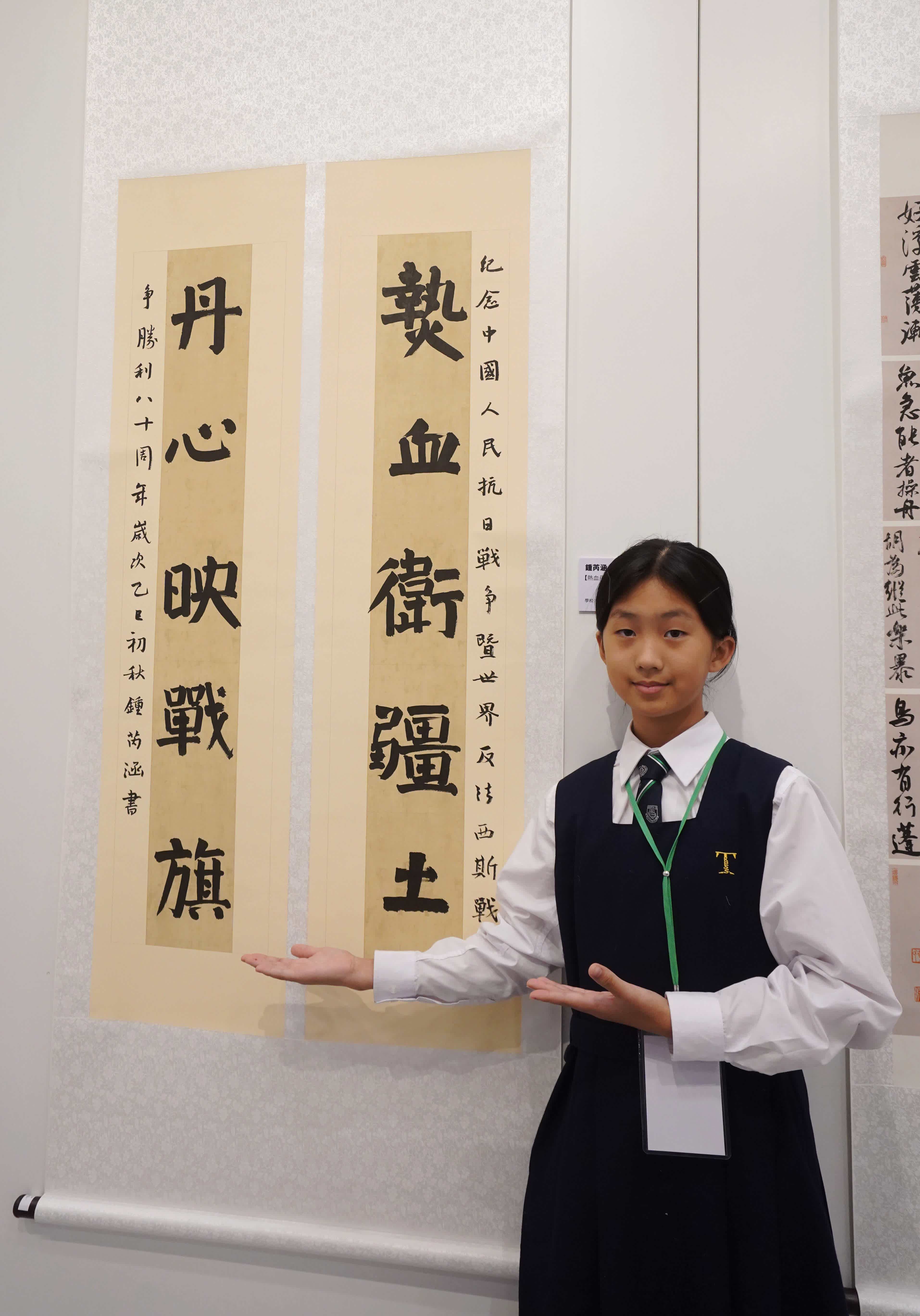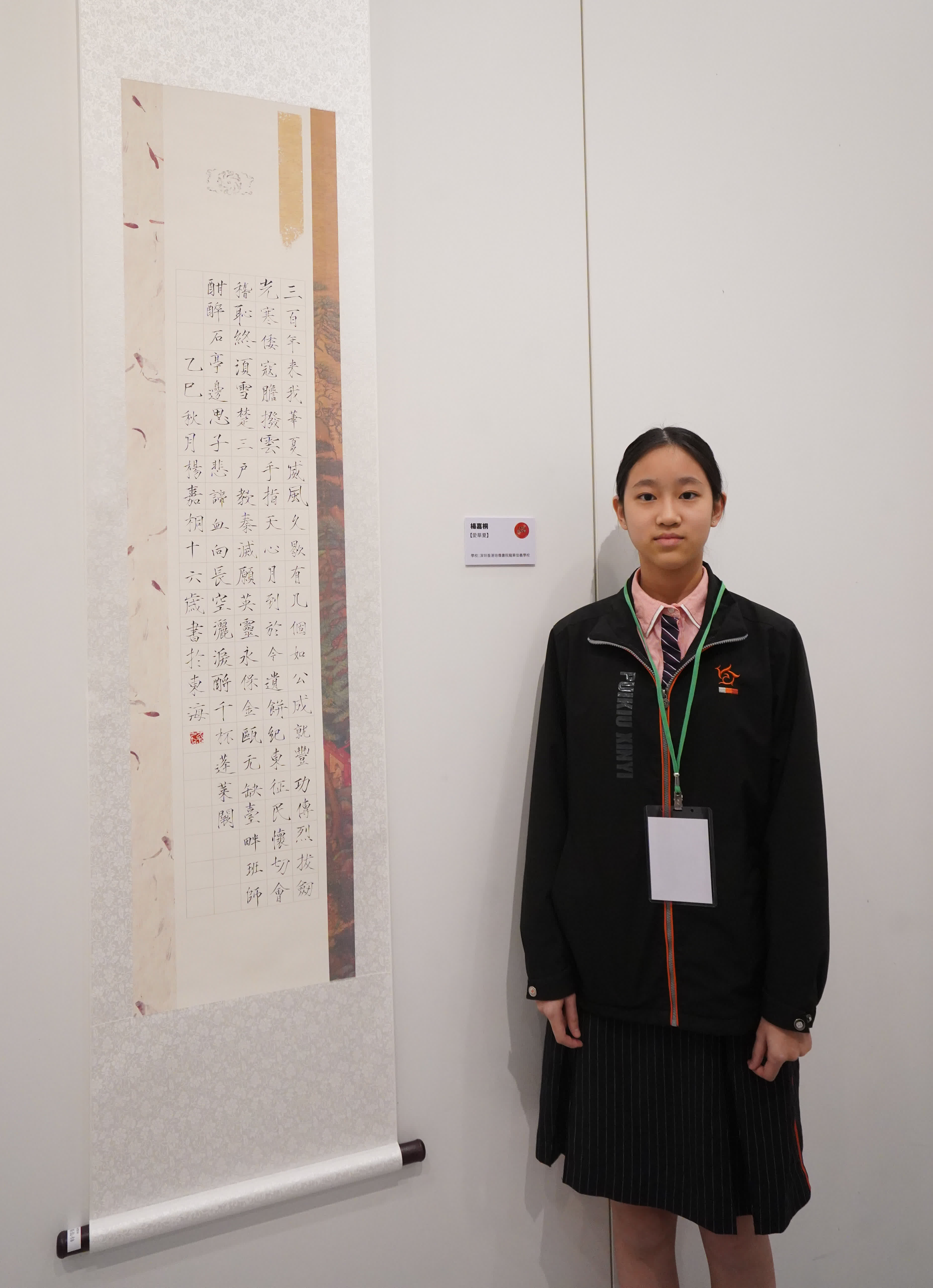 田家炳中學中一生鍾芮涵斬獲毛筆組一等獎。她分享道,自已在比賽中需要全程站着書寫粗勁字體,生動詮釋了「熱血衛疆土,丹心映戰旗」的磅礴氣勢,旨在彰顯守衛國家的強大力量。