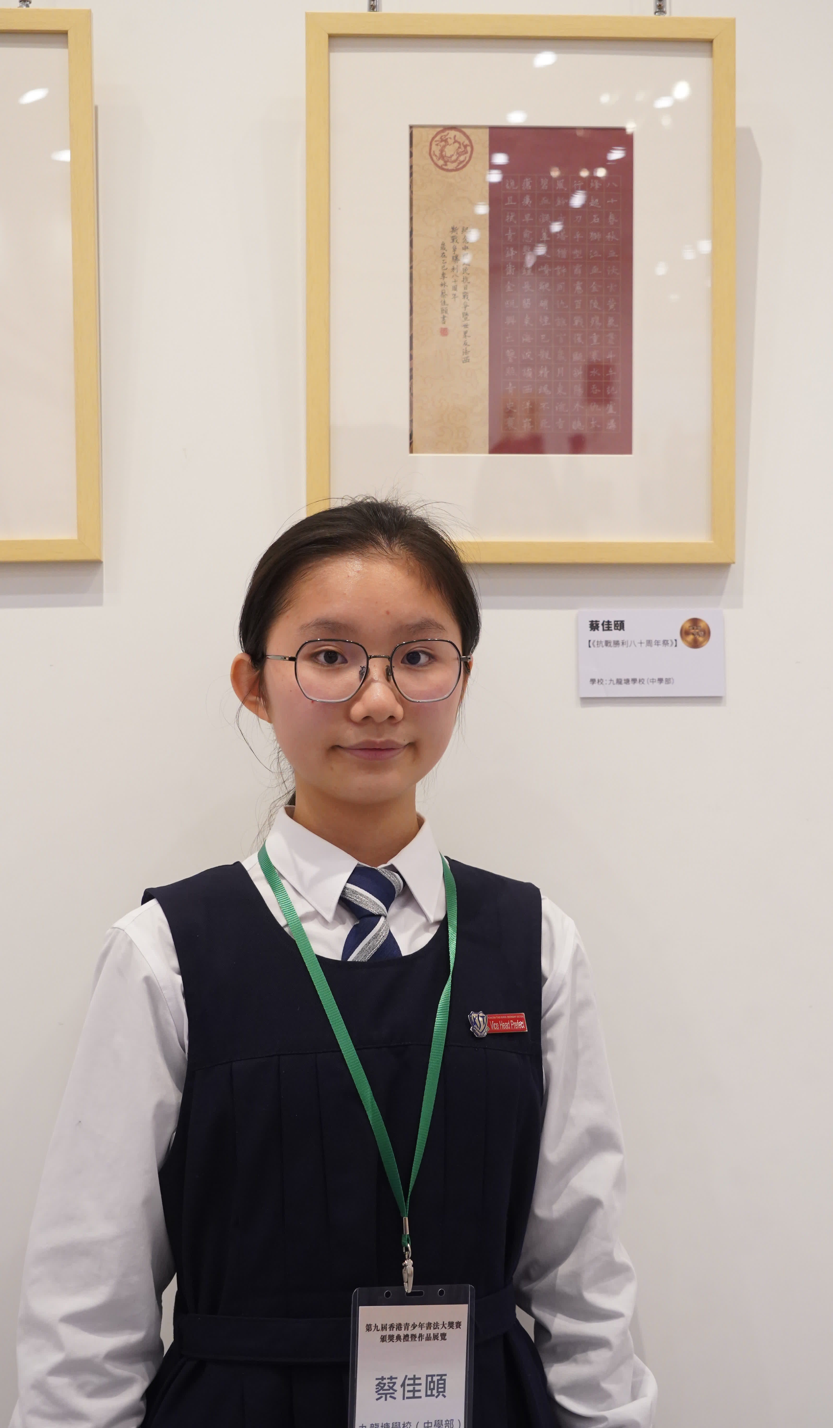 九龍塘學校(中學部)中四學生蔡佳頤首次參賽就贏得硬筆組書法一等獎。談到硬筆書法的經歷,她說已研習五六年,對今年破紀錄8,000份參賽作品,又認為各參賽者表現都十分出色,對自己能獲獎倍感驚喜。她希望通過作品傳播中華優秀傳統文化與香港非遺文化,此次賽事讓她結識了眾多書法高手,更堅定了明年再戰並嘗試毛筆項目的決心。