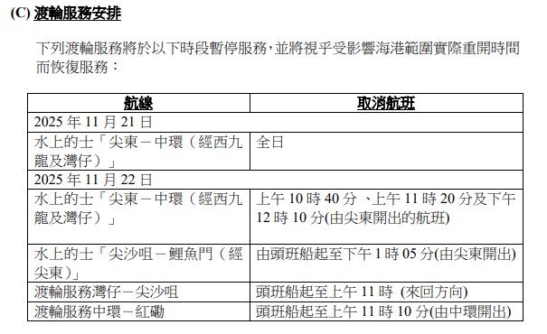 下列渡輪服務以下時段暫停服務,並將視乎受影響海港範圍實際重開時間而恢復服務: