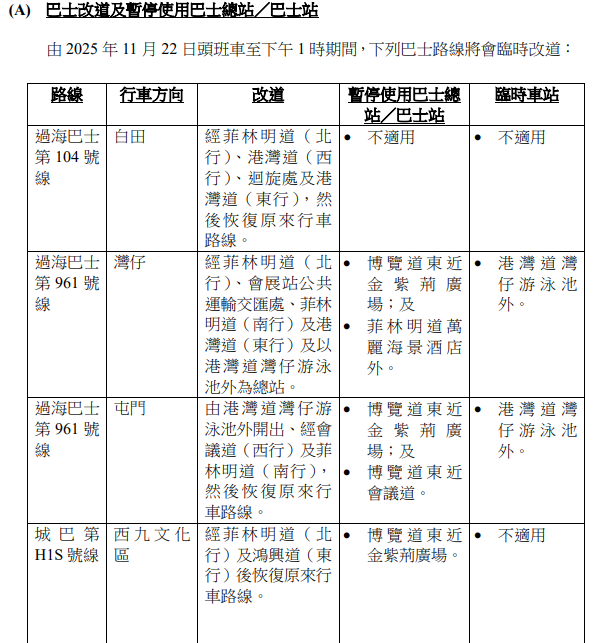 此外,今日由頭班車至下午1時期間,下列巴士路線將會臨時改道: