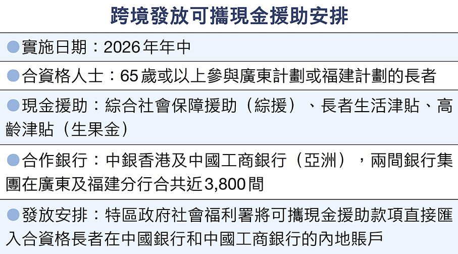(香港文匯報記者 劉明)不少香港長者退休後選擇到內地廣東及福建省生活,香港特區政府社會福利署與中銀香港和中國工商銀行(亞洲)昨日簽署合作備忘錄,於明年中推展跨境發放可攜現金援助安排,屆時社署發放的綜援、長者生活津貼及俗稱「生果金」的高齡津貼,可直接由社署匯入有關長者在中國銀行和中國工商銀行的內地賬戶,無須長者自行辦理由香港戶口匯款到內地的程序。勞工及福利局局長孫玉菡表示,社署與兩家銀行首次攜手合作,實現直接跨境發放可攜現金援助,優化現金福利支付模式,為居住內地的香港長者提供更大便利。