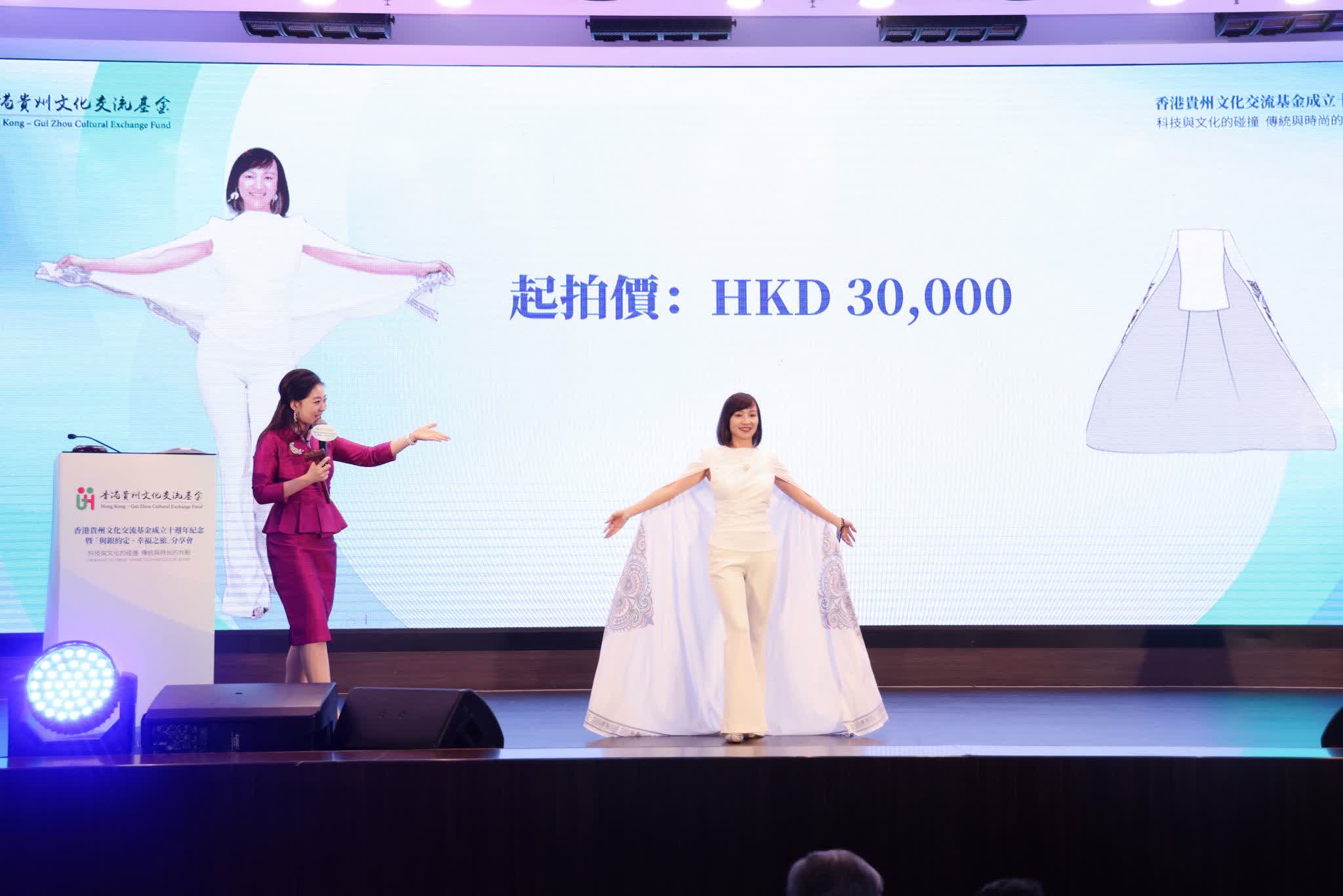 活動現場,黔籍社團與九龍三育中學學生聯袂呈現非遺苗族黑科技時裝表演。服裝由Innotier設計,融合科技功能與苗族刺繡,展現傳統與未來的碰撞。慈善拍賣反響熱烈,尤其得到協辦機構遵理集團、大灣區香港女企業家一眾姐妹及其總會會長黃碧君女士、香港黔青會常務副會長曾濤、香港貴州文化交流基金會副會長楊育清、名譽副會長劉瑩等人紛紛加入競投,現場高潮疊起。
