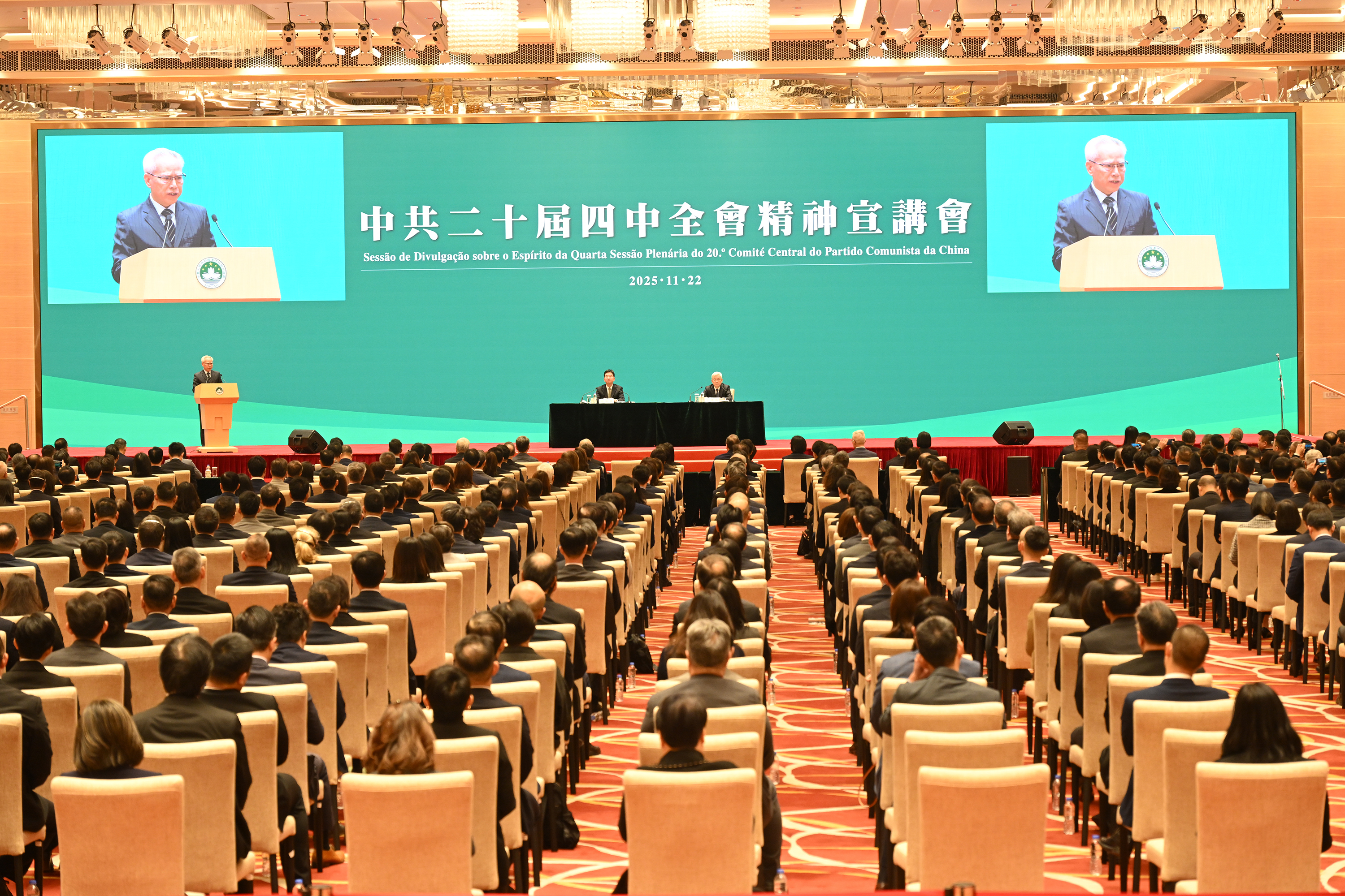 澳門行政長官岑浩輝,中央港澳工作辦公室副主任、國務院港澳事務辦公室副主任、中央人民政府駐澳門特別行政區聯絡辦公室主任鄭新聰分別在宣講會上致辭。侯建國、祝衛東分別作宣講,深入闡釋了中共二十屆四中全會精神,以及《中共中央關於制定國民經濟和社會發展第十五個五年規劃的建議》的主要內容和重大意義,兩位宣講團成員亦回應了與會者提出的問題。岑浩輝作總結發言。