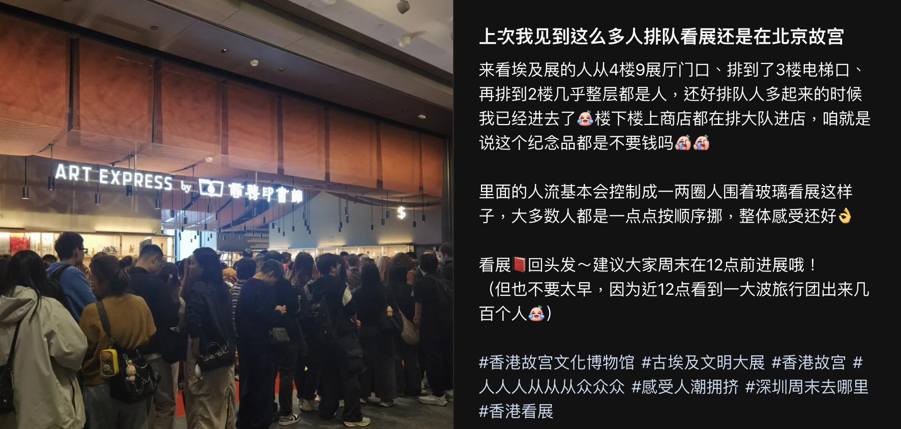 大公文匯全媒體報道,香港故宮文化博物館與埃及最高文物委員會聯合主辦的「古埃及文明大展——埃及博物館珍藏」本周四(20日)起向公眾開放。展覽踏入首個周末(22日)迎來人潮,現場人數眾多,同時每個展館外都「打蛇餅」,排隊最少需時一小時以上。
