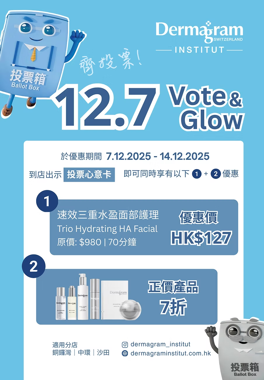 美容中心Dermagram INSTITUT推出雙重優惠,12月7日至12月14日期間,顧客到位於銅鑼灣、中環及沙田的3間分店出示投票「心意謝卡」,皆可以優惠價127港元享有原價980港元/70分鐘的「速效三重水盈面部護理」,亦可以7折折扣購買正價產品,兩項優惠可同時享有。