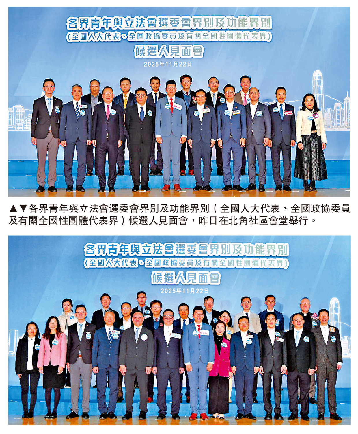 (大公報記者 龔學鳴)為搭建青年與立法會選舉候選人之間的溝通平台,幫助青年深入了解候選人政綱與參選理念,引導青年積極關心及參與選舉事務,「各界青年與立法會選委會界別及功能界別(全國人大代表、全國政協委員及有關全國性團體代表界)候選人見面會」昨日於北角社區會堂舉行。活動邀請到49名選舉委員會界別候選人及2名功能界別候選人出席,與約200名來自工商、創科、社福、基層社團、學生等不同領域的青年交流,實現廣泛對接。