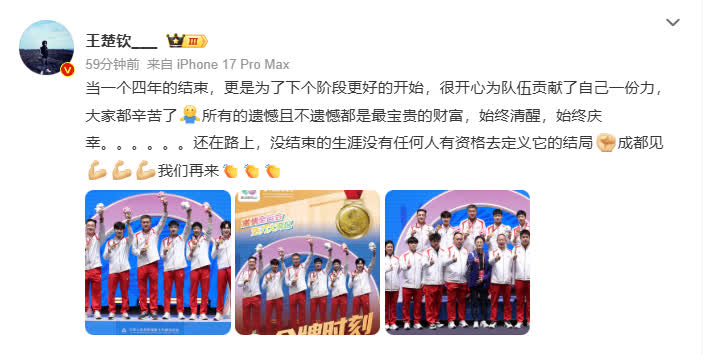 大公文匯網報道,11月23日,王楚欽全運會後發文:「當一個四年的結束,更是為了下個階段更好的開始,很開心為隊伍貢獻了自己一份力,大家都辛苦了,所有的遺憾且不遺憾都是最寶貴的財富,始終清醒,始終慶幸。還在路上,沒結束的生涯沒有任何人有資格去定義它的結局。成都見,我們再來。」