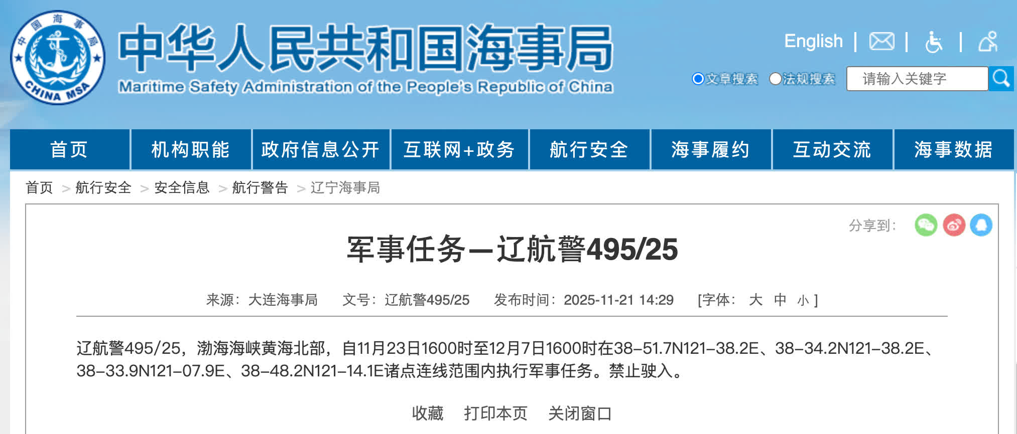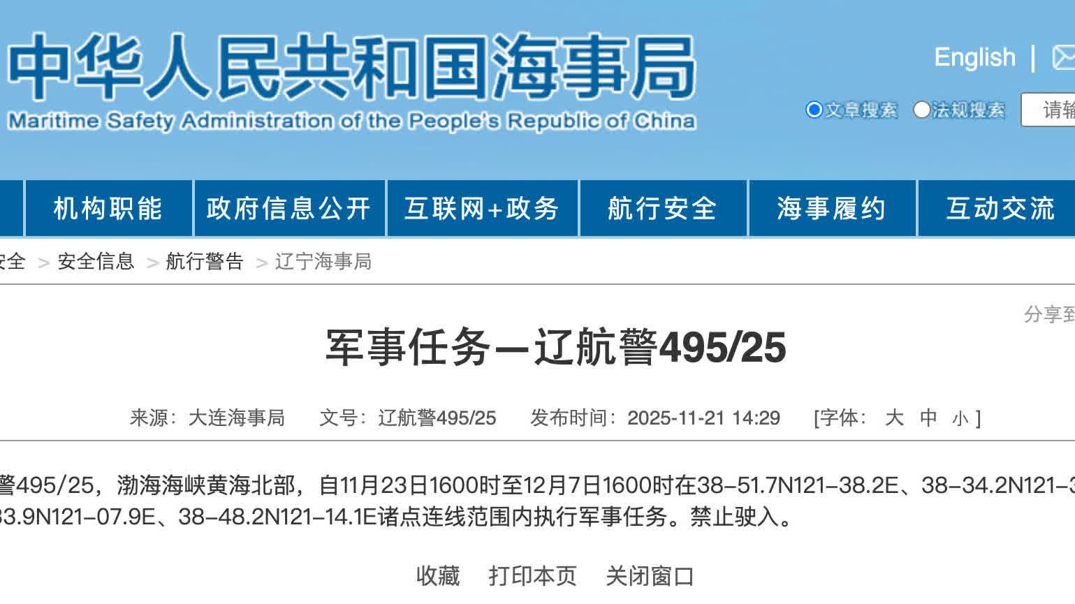 (大公文匯網記者 任芳頡)據中國海事局網站消息,大連海事局發布航行警告,11月23日16時至12月7日16時,渤海海峽黃海北部部分水域範圍內執行軍事任務,禁止駛入。值得注意的是,這已經是一周之內第二次軍事演習。中國海事部門本月19日發布航行警告:渤海海峽、黃海北部部分水域,自當日0時至24時,執行軍事任務,禁止船隻駛入。軍事專家宋忠平接受本網採訪指出,此次系列軍事行動針對性明確,是中國對近期外部勢力涉台挑釁的有力回應,此舉是維護國家安全的必要舉措,既符合國際慣例,也是主權國家正當權利的體現,更以實際行動昭告核心利益紅線不容任何勢力踏越。