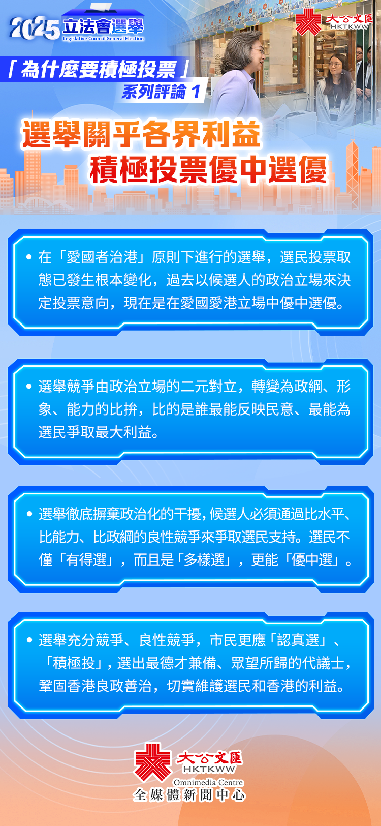 事實充分證明,新選制下的立法會選舉,候選人都是愛國愛港、有擔當、有才幹的人士;選舉徹底摒棄政治化的干擾,候選人必須通過比水平、比能力、比政綱的良性競爭來爭取選民支持。這樣的選舉,選民不僅「有得選」,而且是「多樣選」,更能「優中選」,選民更應認真比較、仔細挑選,踴躍投票,選出「愛國愛港立場更加堅定、為港為民服務更加熱誠;更加勤勉努力工作、更善於履職盡責;更加年輕專業、更具創新創造活力;更加清正廉潔、更有良好操守形象」的民意代表,更好地維護選民、社區和業界的利益,推動香港加快邁向由治及興。