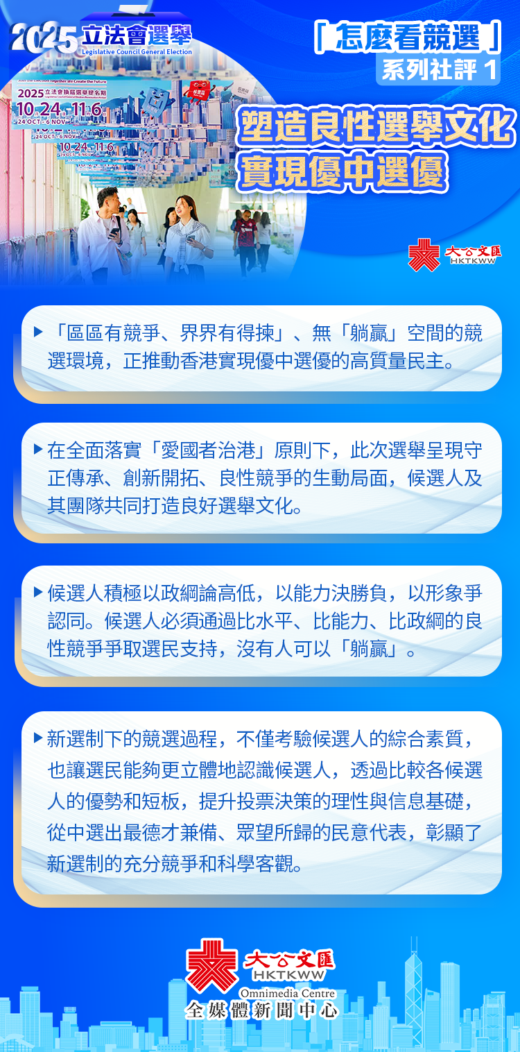 在新選制下展開的第八屆立法會選舉,充分體現了選舉選賢任能、促進發展的優越性。由特區政府主辦的「愛國者同心治港」選舉論壇,已成為本屆立法會選舉的一大亮點。地方選區、選委會、功能界別的高質量論壇,為候選人展現政綱、能力提供平台,地區直選候選人在社區積極拉票,展現新選制下充分競爭、良性競爭、公平競爭的嶄新良性選舉文化。「區區有競爭、界界有得揀」、無「躺贏」空間的競選環境,正推動香港實現優中選優的高質量民主。
