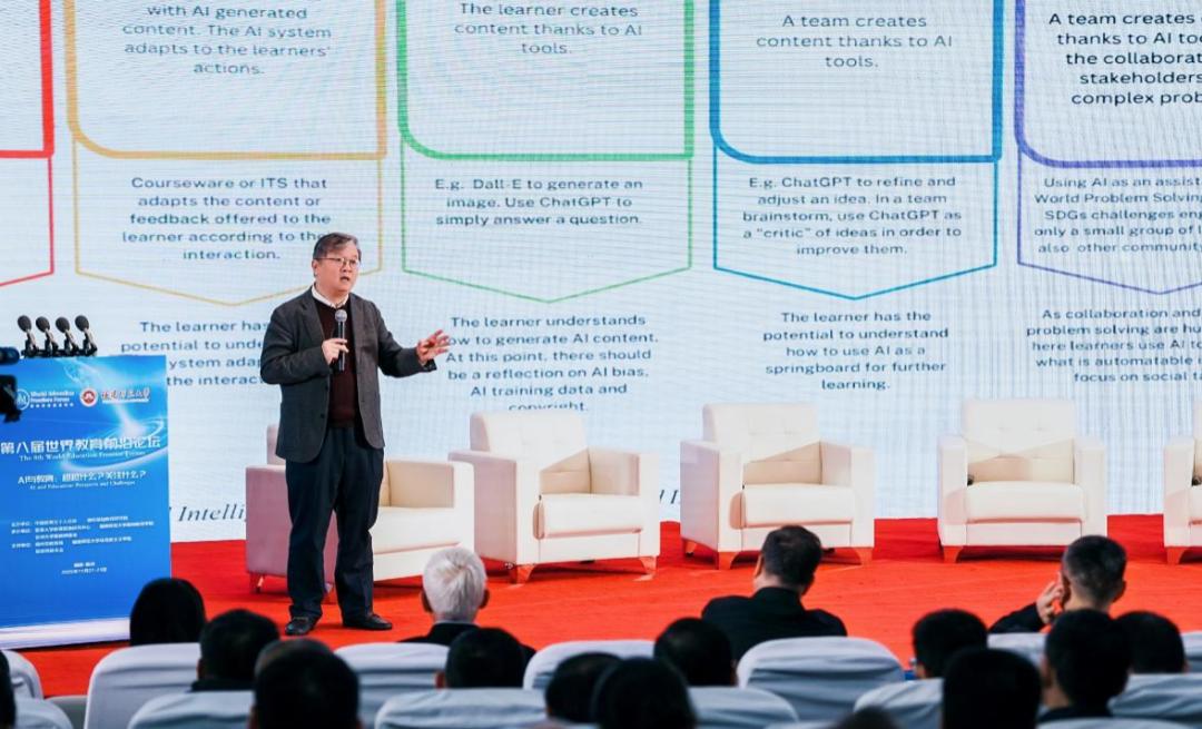 程介明在致辭中指出人工智能正在重塑全球教育圖景,希望與大家深入探討並共同展望AI在教育領域的應用及未來發展。郭毅可帶來《人工智能與未來教育》為主題的主旨演講。他認為,AI給教育帶來的衝擊是顛覆性的,它打破了知識稀缺的壁壘,迫使教育重新審視自身定位。教育的重心需從「學什麼」轉變為「為何學」「如何用」,也就是從單純記憶知識,轉向着重培養理解、批判以及創造的能力。他進一步指出,教育需實現四大進化:其一,從知識傳授邁向能力培養;其二,從面向大眾的統一模式轉向個性化定製;其三,從學生被動接受知識轉為主動探索求知;其四,從機械式學習轉變為注重人性關懷與創造力激發。他舉例闡釋,藉助AI模擬國際關係博弈場景,讓學生在親身實踐中學習,這正是主動探索精神與能力培養的生動體現。