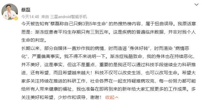 蔡磊表示,長期以來,部分自媒體一直炒作他的病情,時而造謠 「身體好轉」,時而渲染 「病情惡化」,嚴重偏離事實。他不得不來說明一下,漸凍症殘酷致命,他的身體也在持續惡化,並不美好,這是事實,但這不是重點,重要的是他還可以通過科技手段繼續全力科研推進,還有希望,而且希望越來越大!