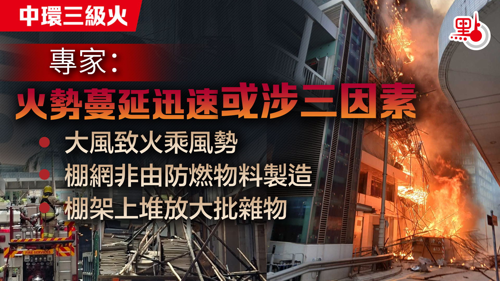 李光昇又估計,棚架起火的火源最常見是來自工友吸煙丟棄的未熄滅煙頭,其次可能是用火的工序,例如燒焊或打磨的火屑,隨時千多度,一下子便可燒着物件引起大火。