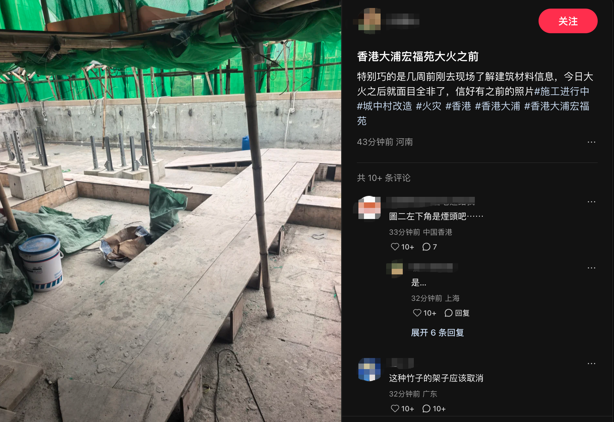 大公文匯全媒體報道,大埔宏福苑今日(26日)下午2時51分突發火警,火勢猛烈,三小時內由三級升至五級。有網友在社交平台發文指,幾周前曾去到宏福苑現場了解建築材料信息,並附上現場圖片。據網友發布照片,在施工現場有熄滅煙頭。