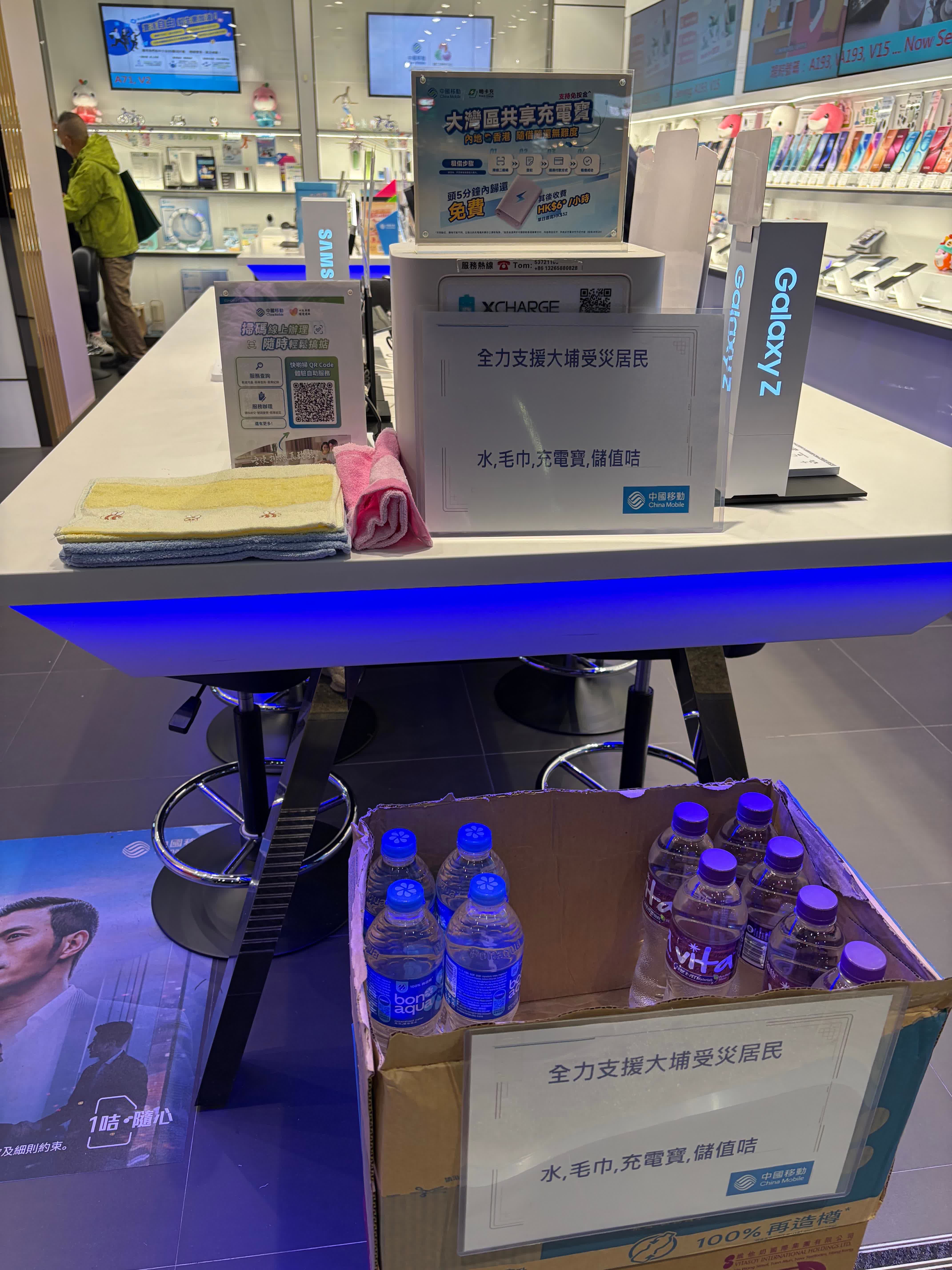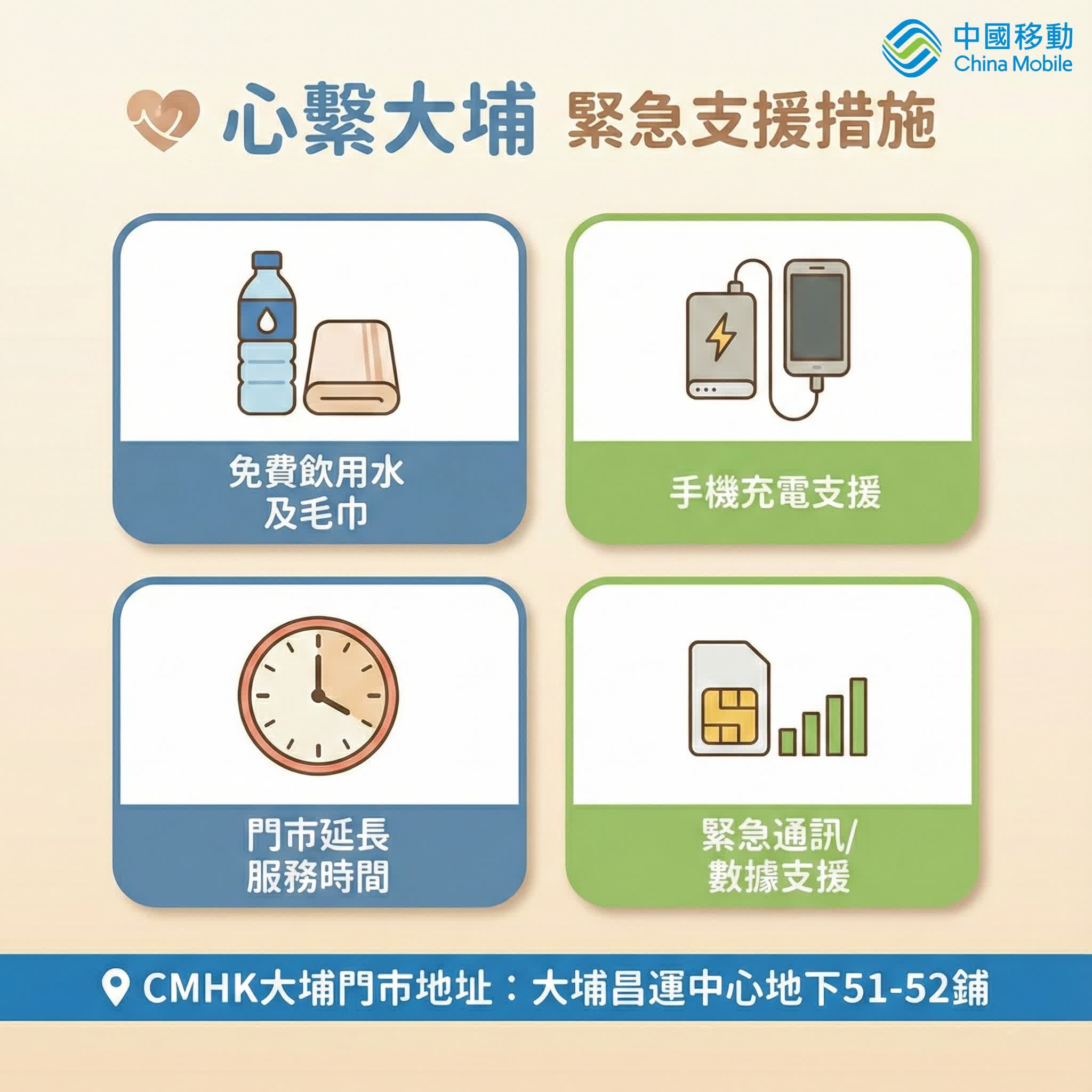 中國移動香港(CMHK)表示,公司心繫大埔社區,已在大埔昌運中心地下51-52號鋪的分店設立支援站點,提供以下緊急服務:包括準備充足的飲用水、毛巾等應急物資,同時提供充電寶借用服務,確保居民通訊設備不斷電。