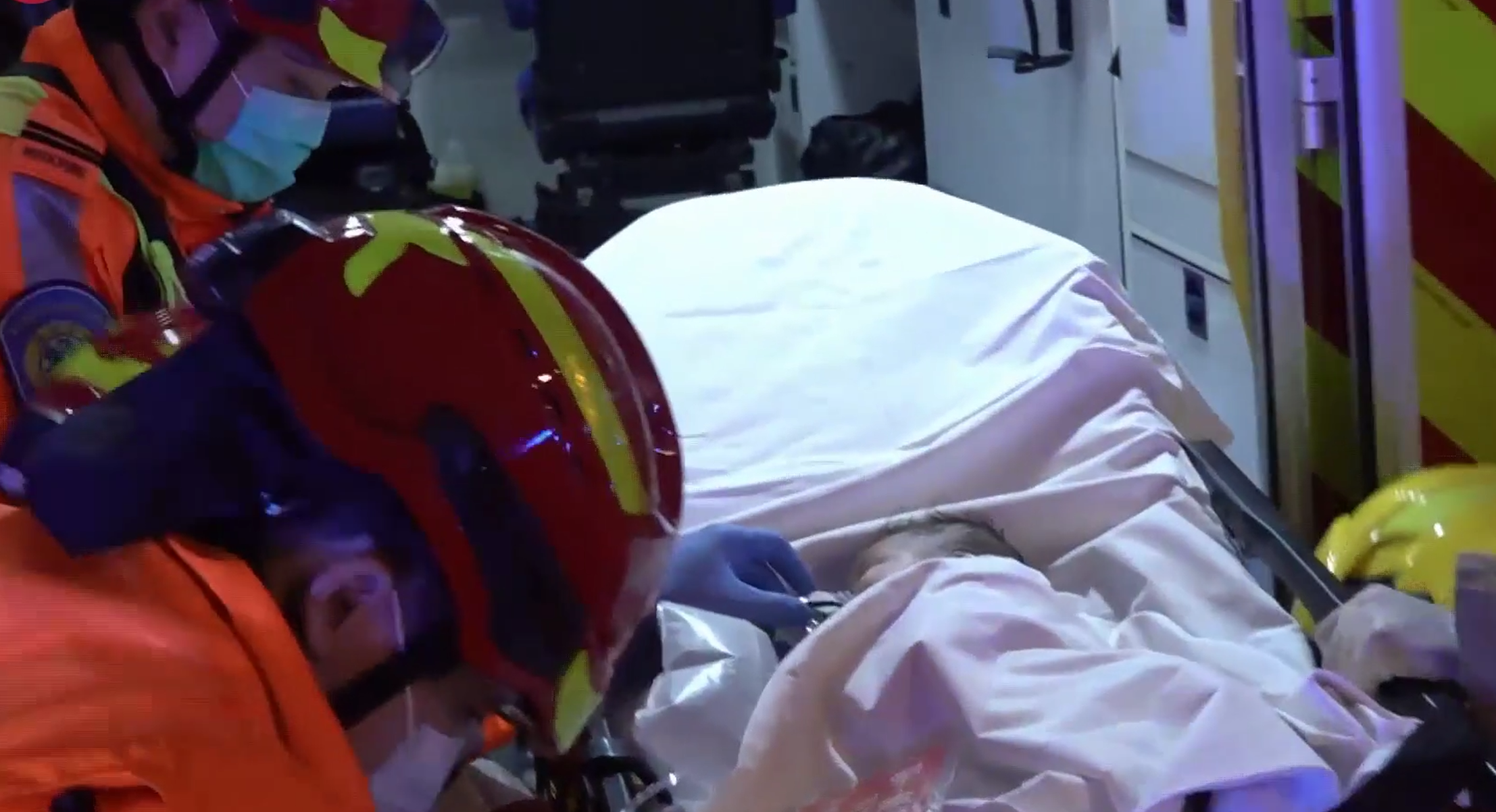 其中有傳媒影到一名嬰兒獲救,需要戴上氧氣罩協助呼吸,救護員為嬰兒進行治理。