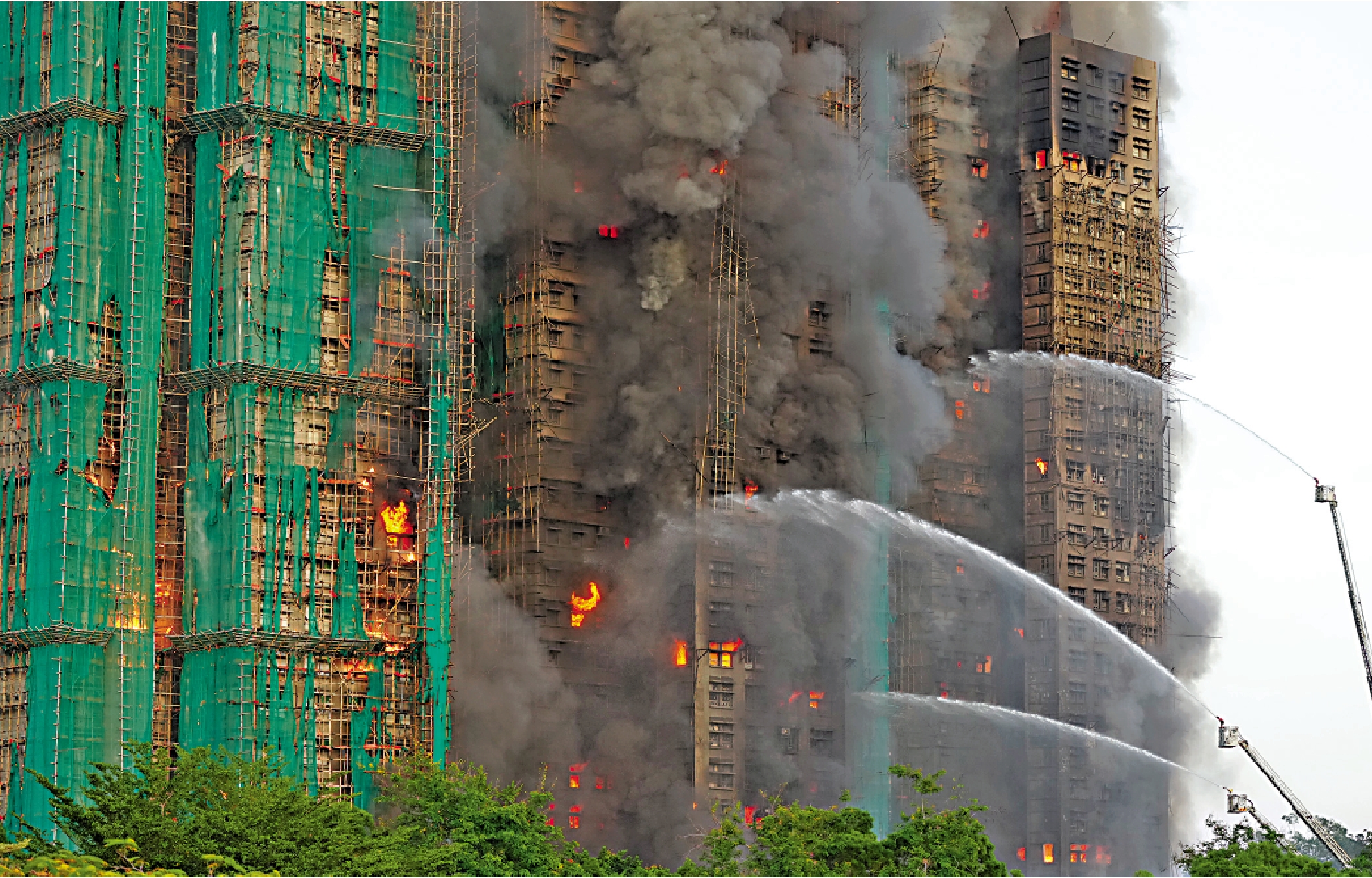 發生五級火的大埔居屋宏福苑,共有八座大廈,目前正全部進行大維修工程,有棚架及棚網包圍。隨着火勢蔓延,大廈外圍大片的棚網被焚燒,多層棚架不斷跌落。香港執業安全師學會教育及培訓委員會主席廖家俊昨日接受大公報訪問表示,今次火勢蔓延速度之快,令人震驚,短短數小時內,便從棚架蔓延至樓宇內部,更波及相鄰建築,認為火勢難控的主因在於棚架相關物料,及現場雜物堆積,進一步助長了火勢。