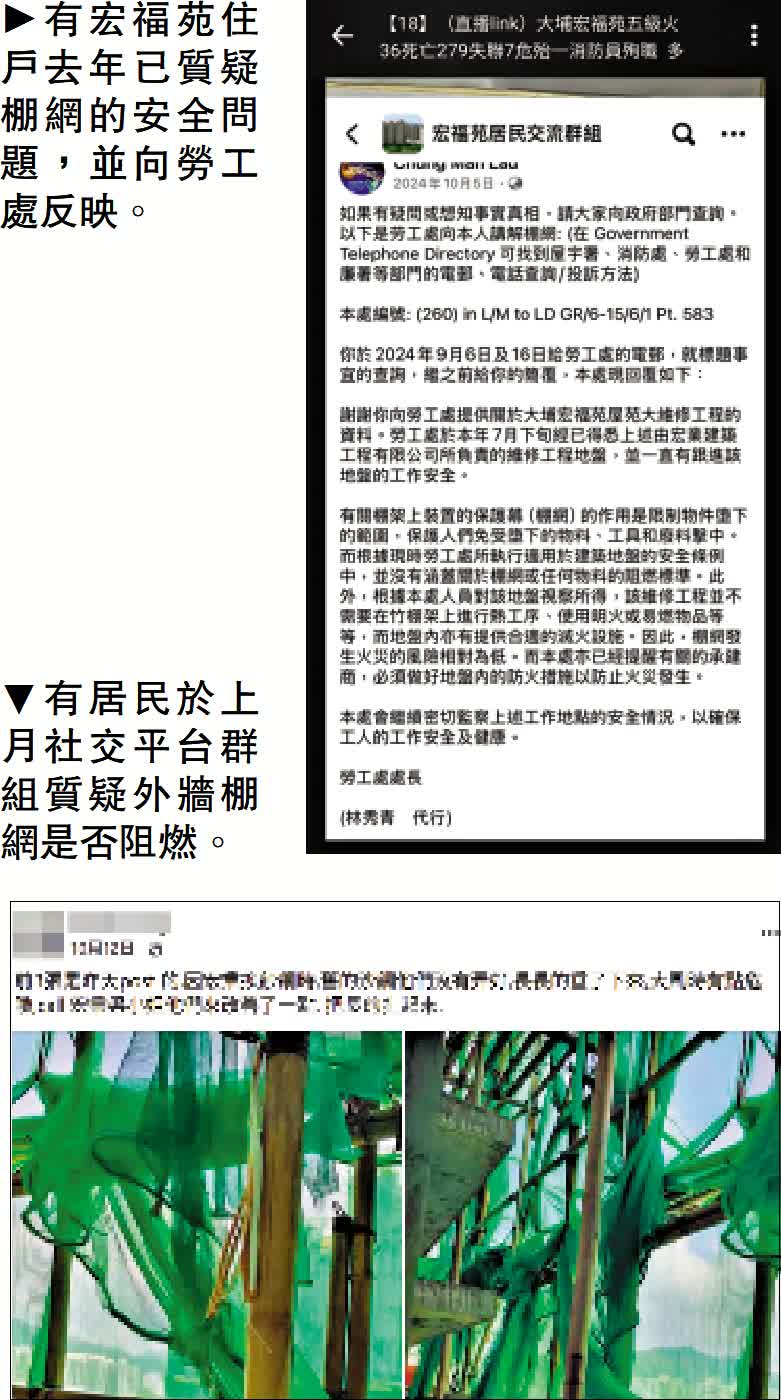 記者鄭文迪報道:大埔宏福苑是一個樓齡超過40年的居屋屋苑,現正進行大維修,原訂明年3月至6月完成工程並分批拆除棚架。早前超強颱風「樺加沙」襲港期間,有關棚架曾出現損毀,在10月上旬需進行加固修葺工作,當時有居民於社交平台群組發文,直指紗網垂下相當危險,更有人質問棚網是否阻燃。