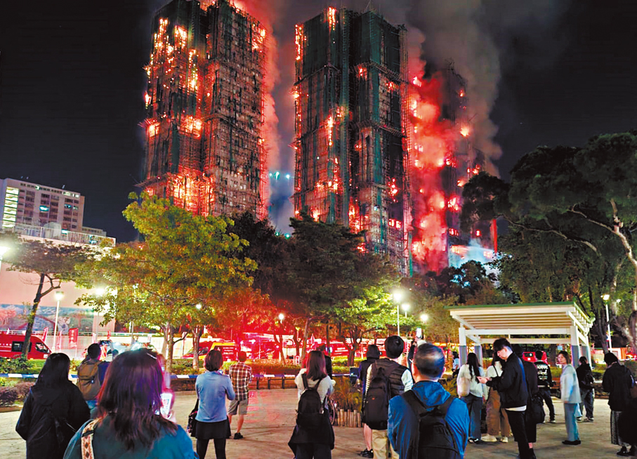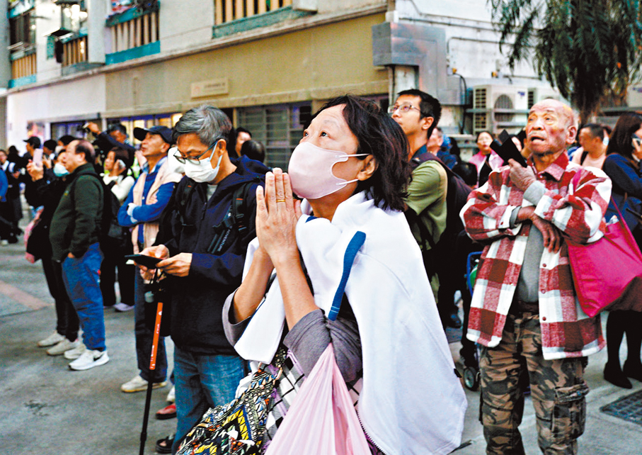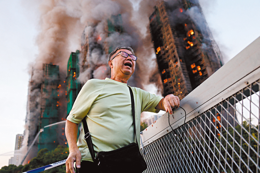 (香港文匯報記者 蕭景源)大埔宏福苑火警五級火,整個屋苑8座樓宇當中7座俱遭波及,大批居民倉皇逃生。有逃出的居民站在遠處,默默看着燃燒的樓宇,滿心惆悵;有人望着毀於一旦的家園,泣不成聲;亦有人無奈站在遠處,默默祈禱。現場有街坊直言「冇啦,咁樣燒法。」有居民表示,火警發生時,警鐘沒有響起。