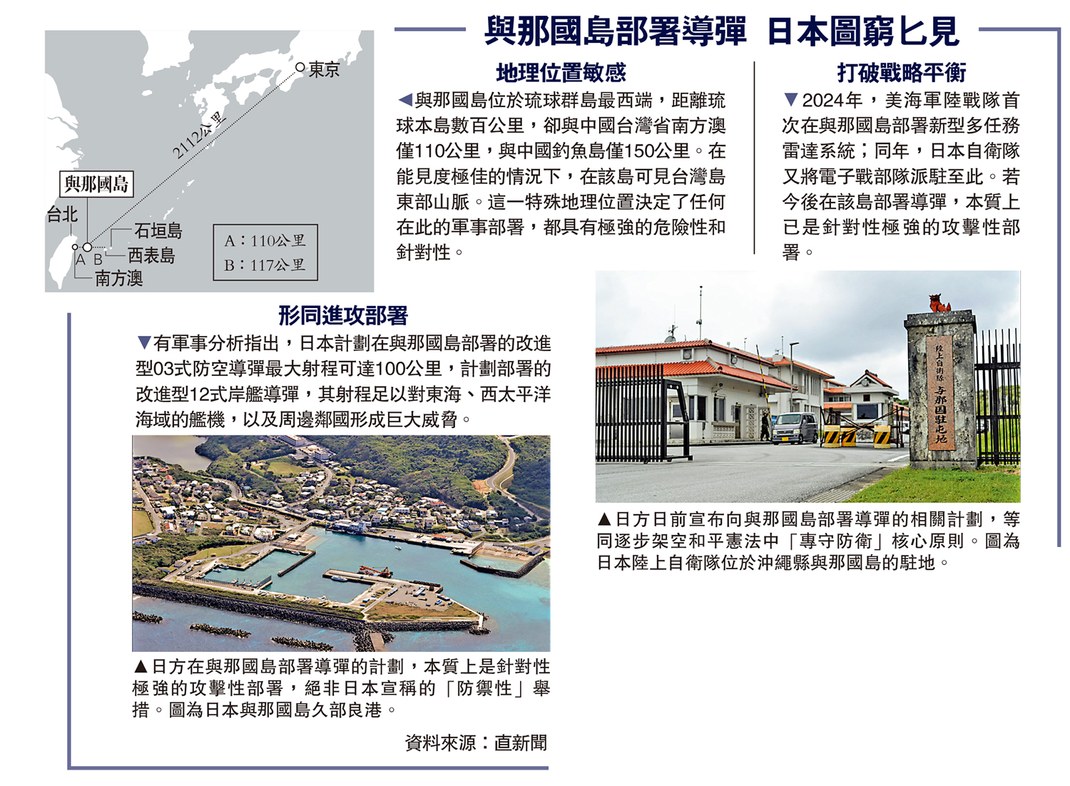 與那國島是琉球列島中最靠西南的島嶼,面積僅28平方公里,距中國固有領土台灣島僅110公里,距離日本本土卻逾1000公里。這一特殊地理位置決定了任何在此的軍事部署,都具有極強危險性和針對性。若日方今後在該島部署導彈,本質上已是針對性極強的攻擊性部署,只會構成新的軍事對峙點,進而打破台海周邊的戰略平衡。