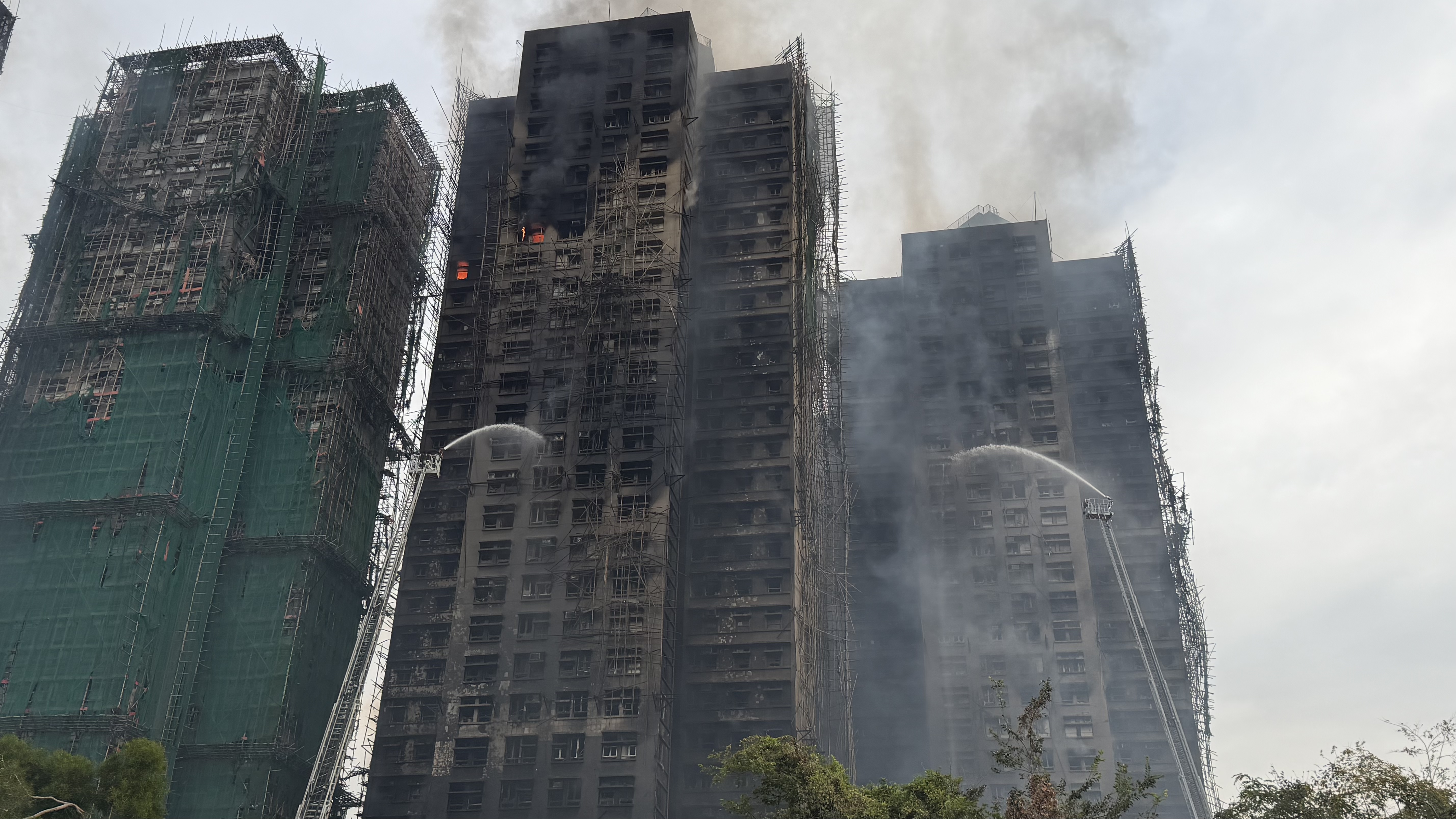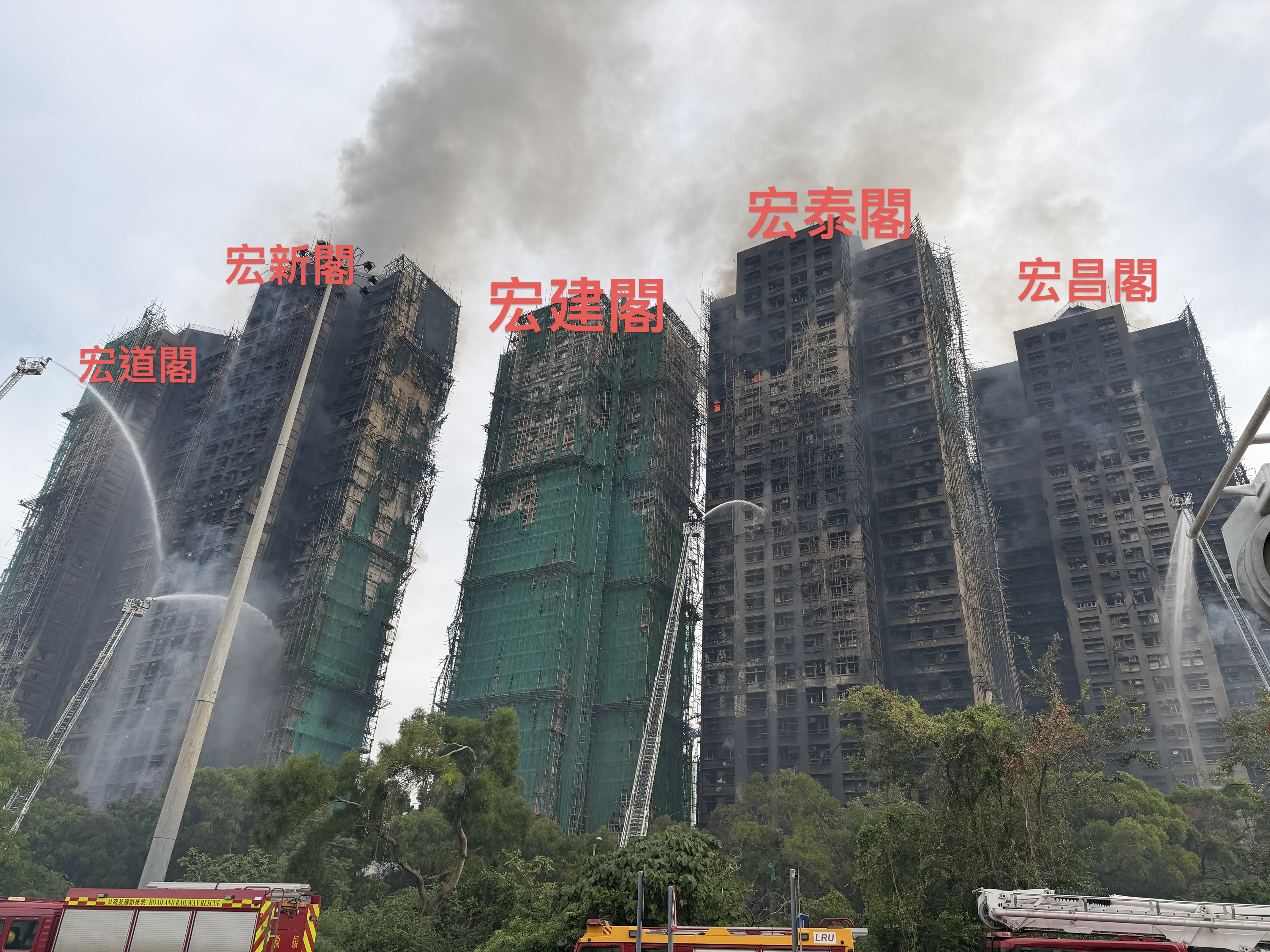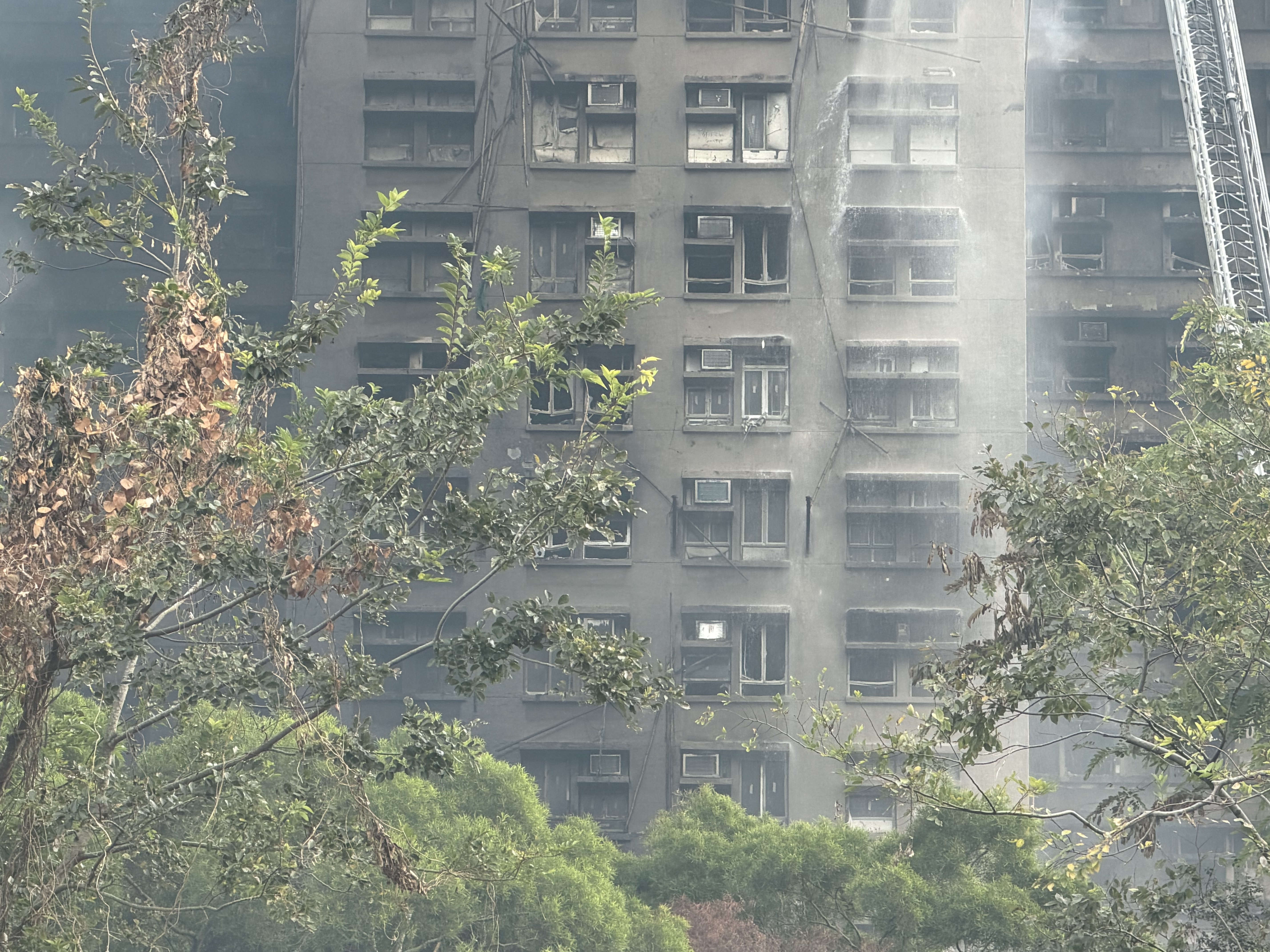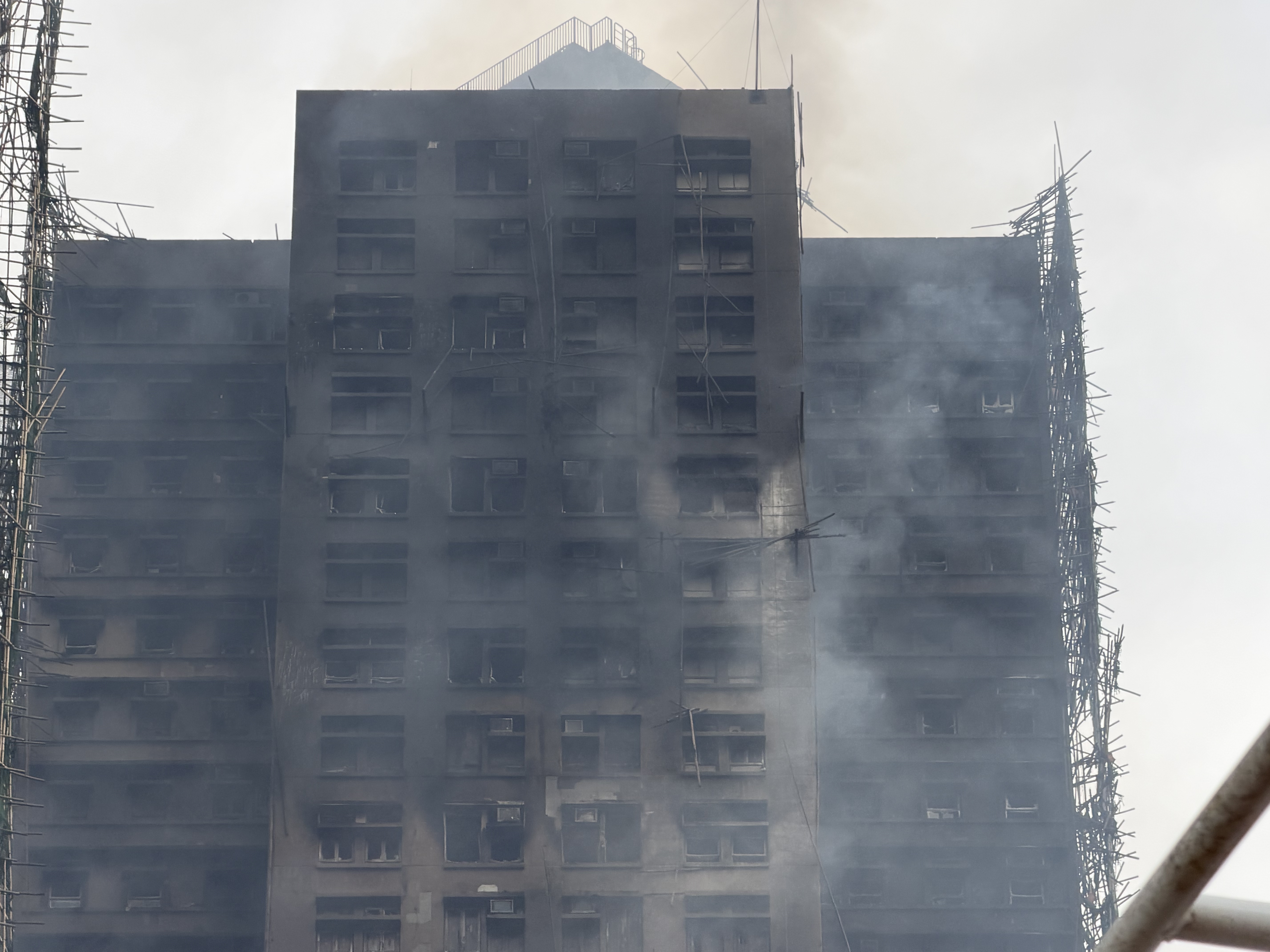 截至今日(27日)上午7時許,大公文匯全媒體記者現場所見,最先起火的宏昌閣外牆全部被燒黑,肉眼可見中層仍有火星,消防水喉仍在對準中層進行撲救。相比底層,宏昌閣中高層窗體損壞嚴重,只剩窗架,高層外牆呈漆黑,不斷有濃煙冒出。