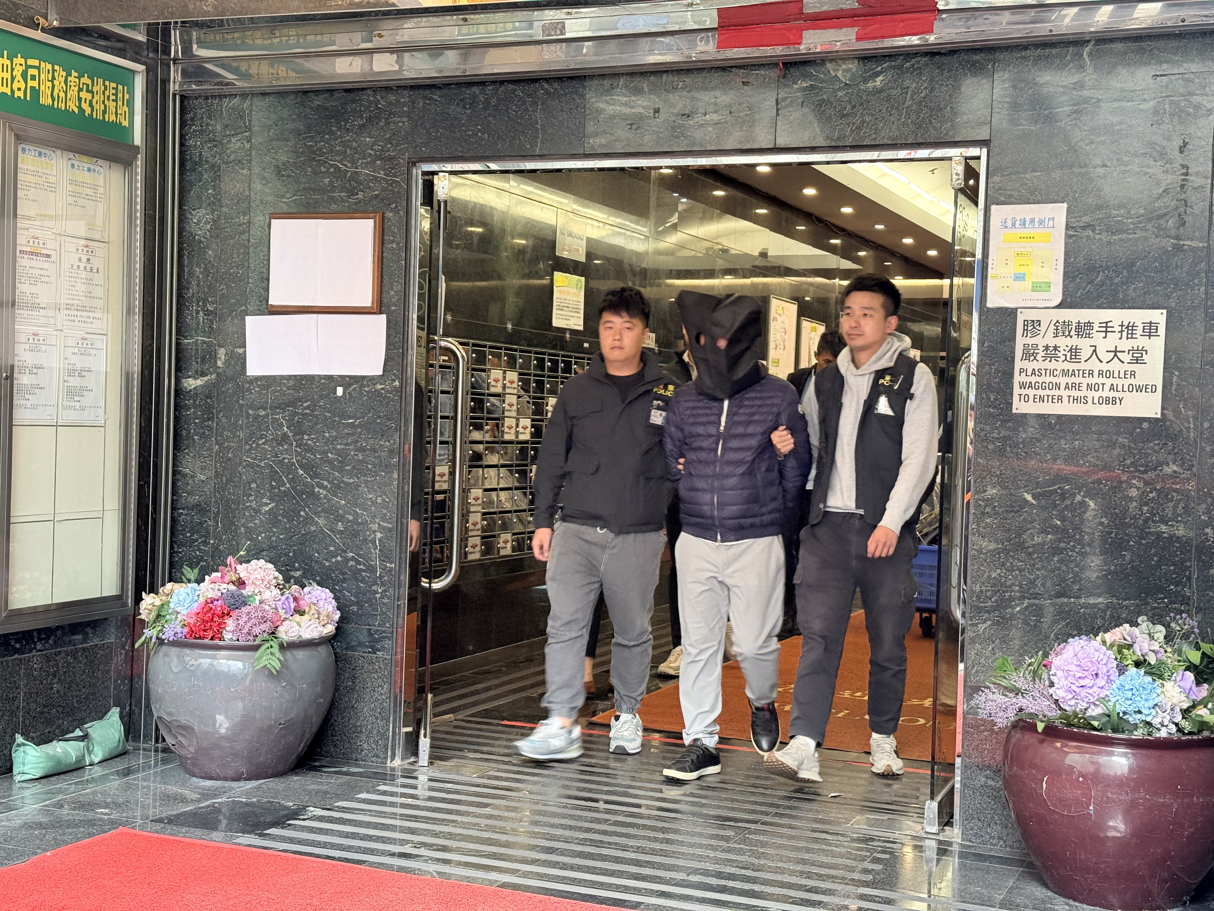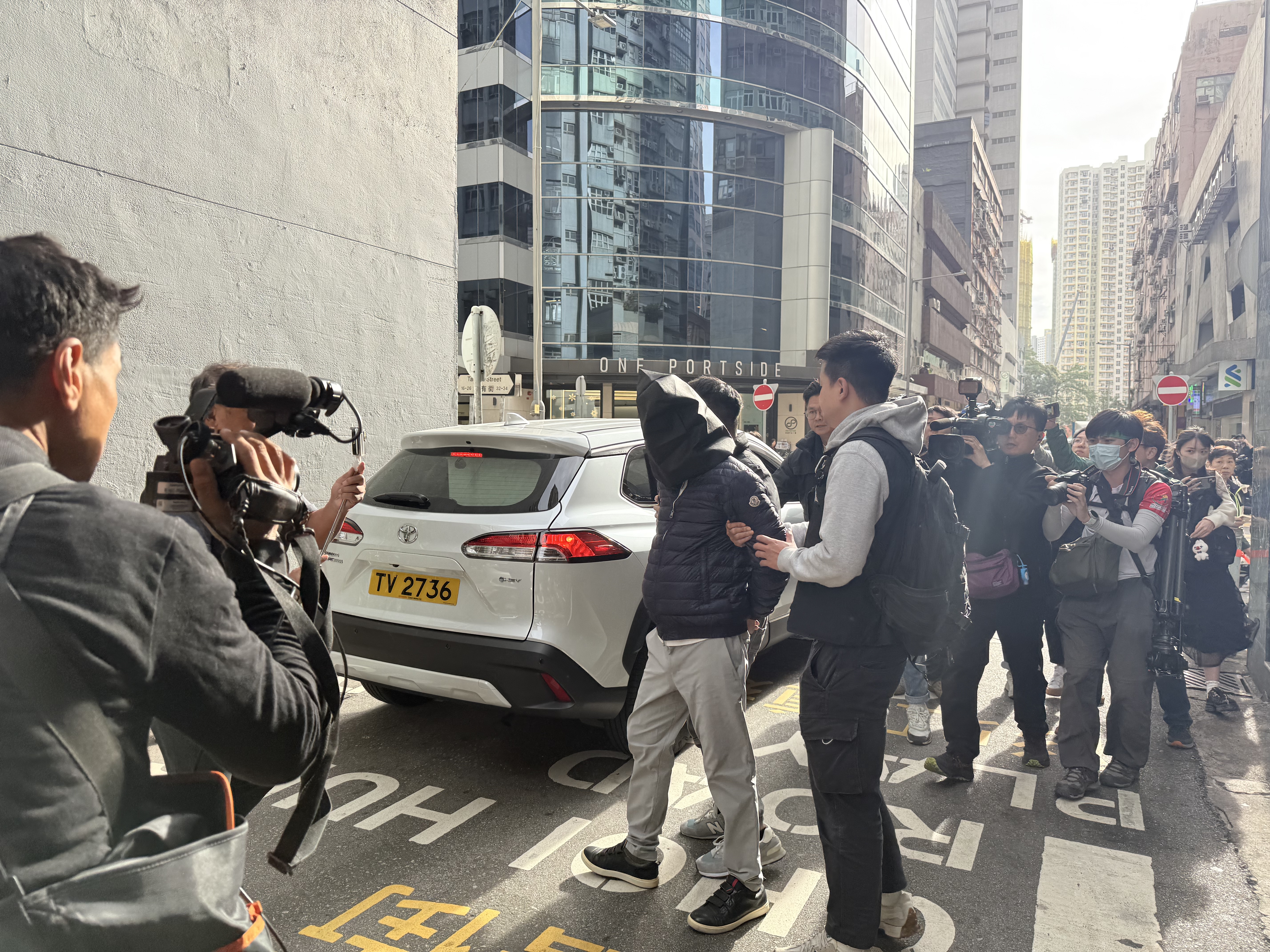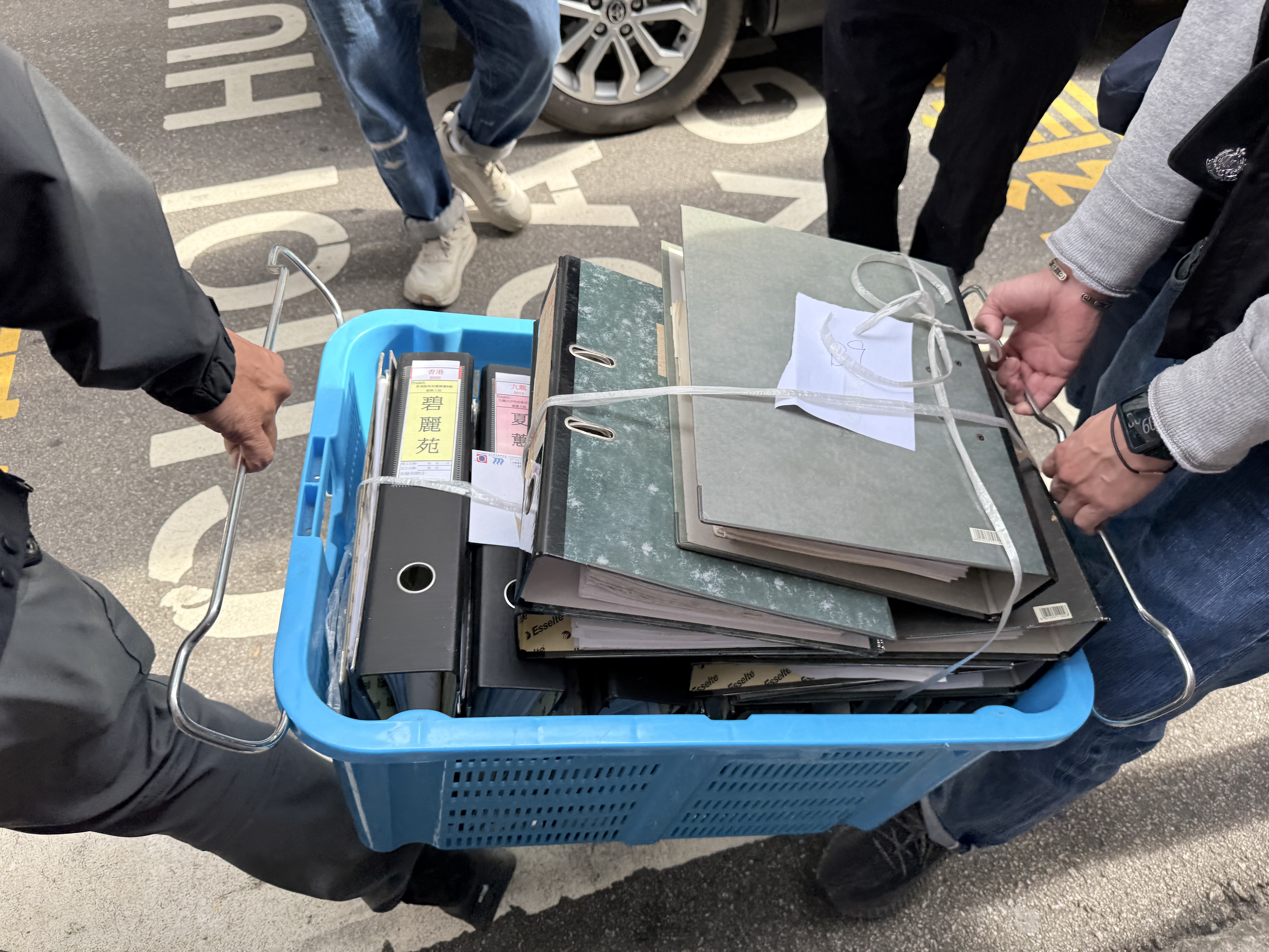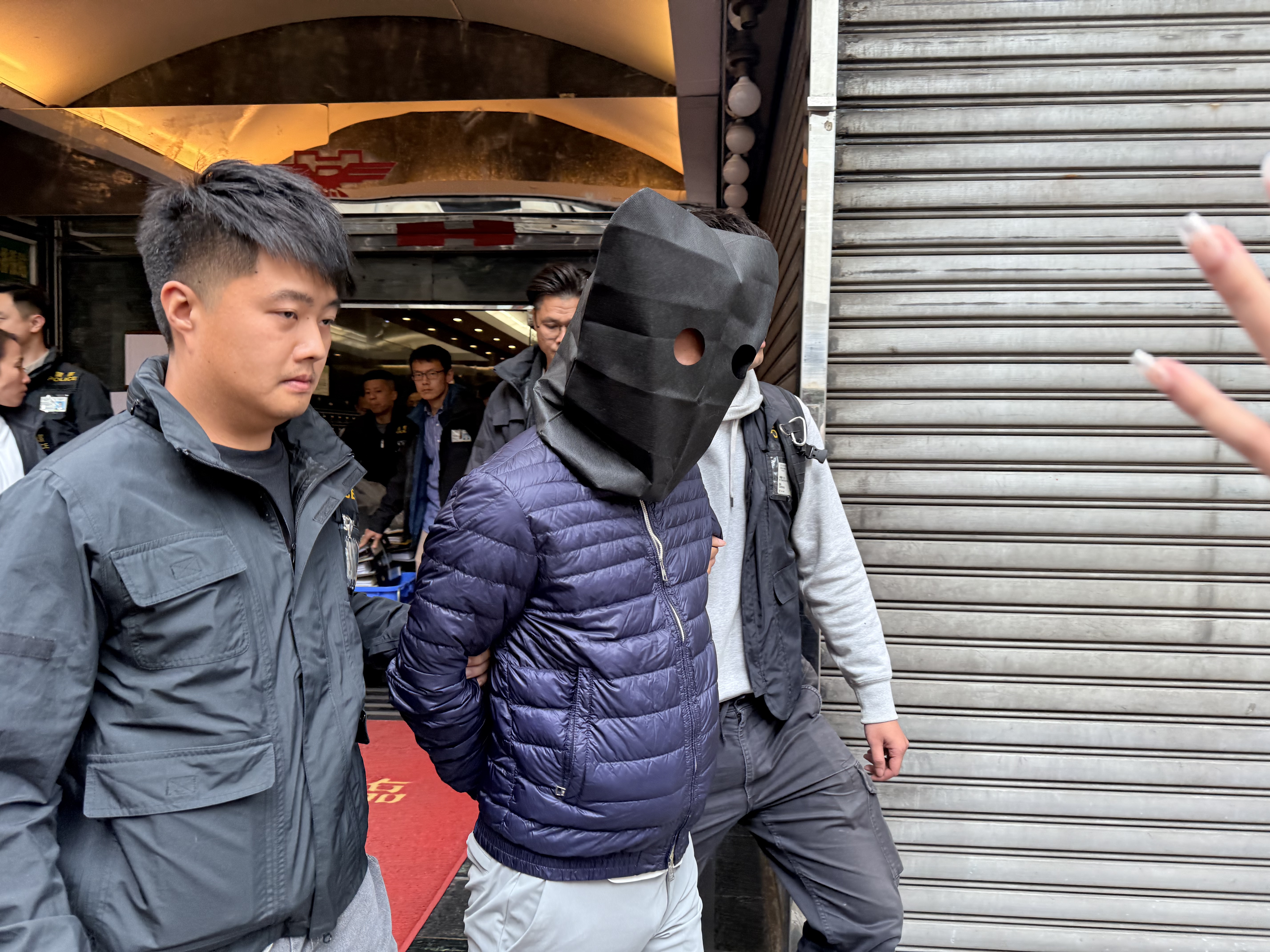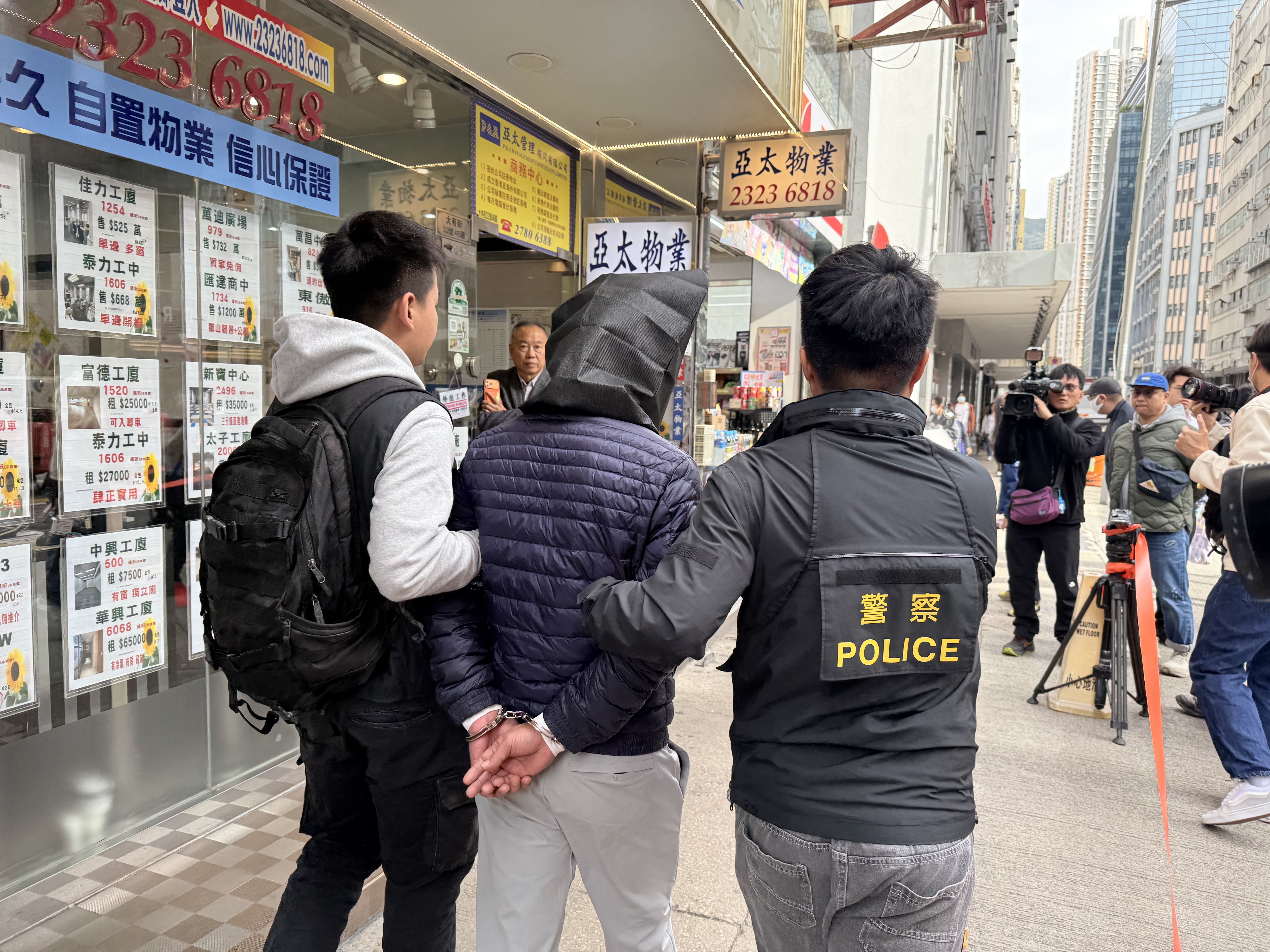 至今日(27日)早上8時許,警方到工程公司位於新蒲崗的寫字樓調查搜證,可見已檢取大量文件,相信準備帶走作進一步調查,其後以黑布蒙頭帶走一名男子。