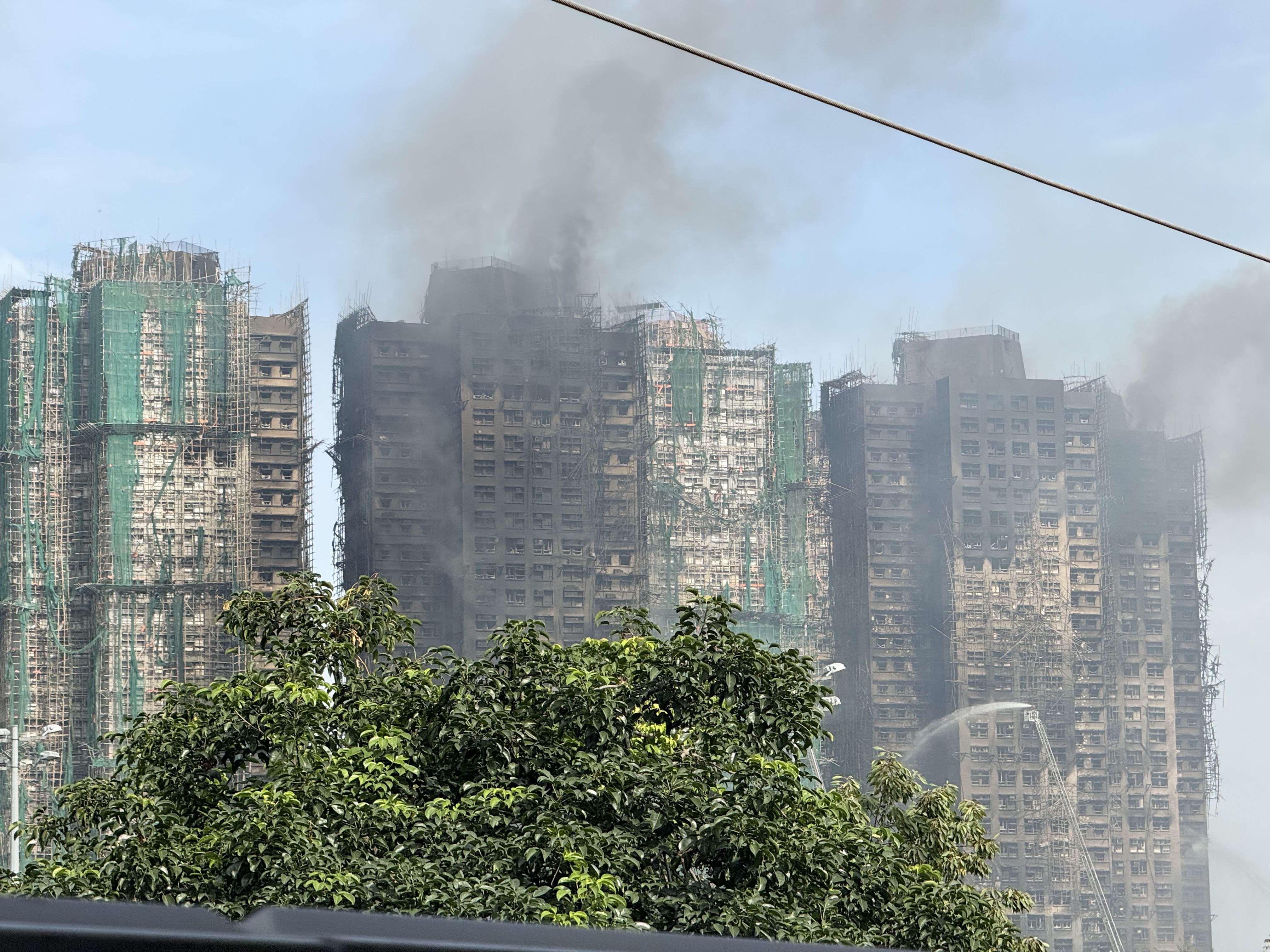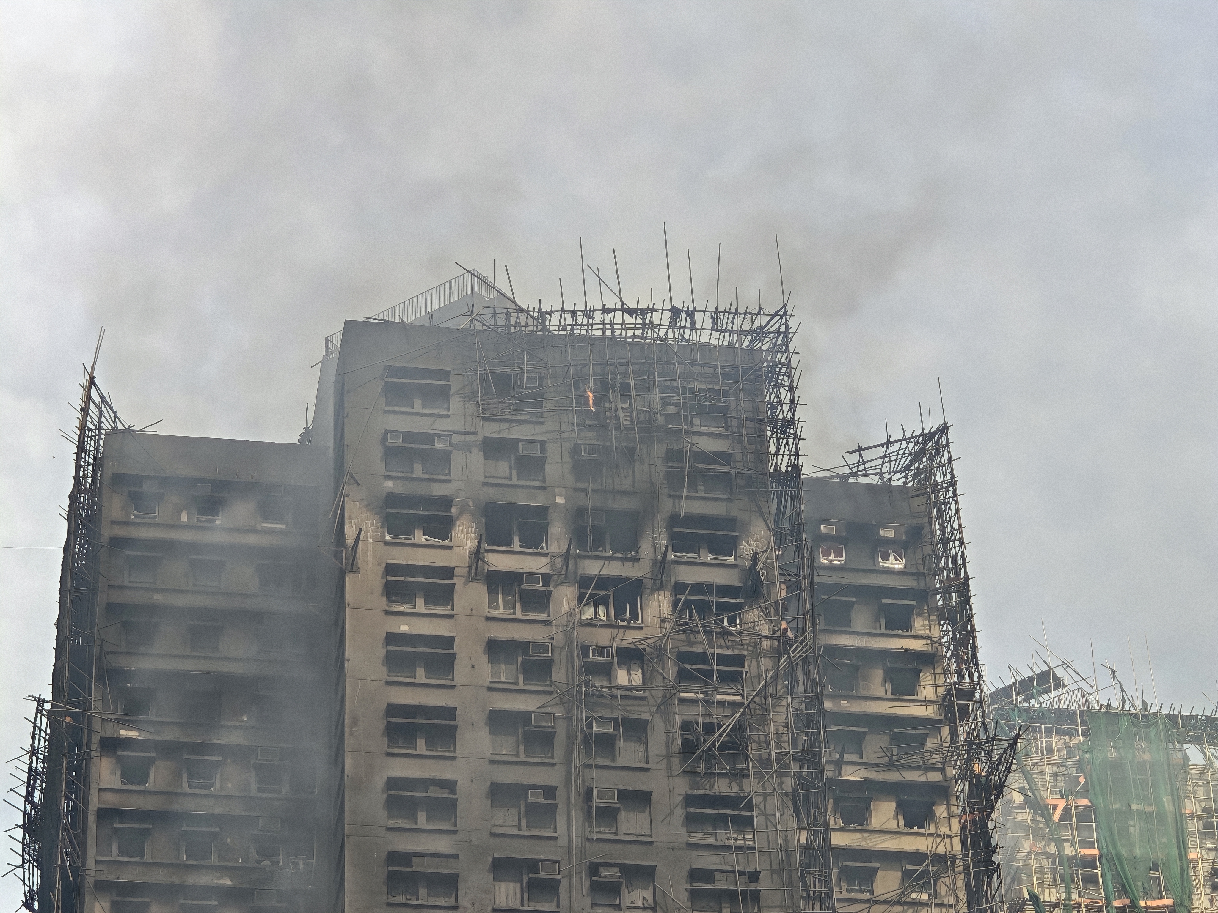 記者現場看到,宏新閣外牆竹架和圍網幾乎被完全燒毀,只留側面部分結構在空中懸掛。