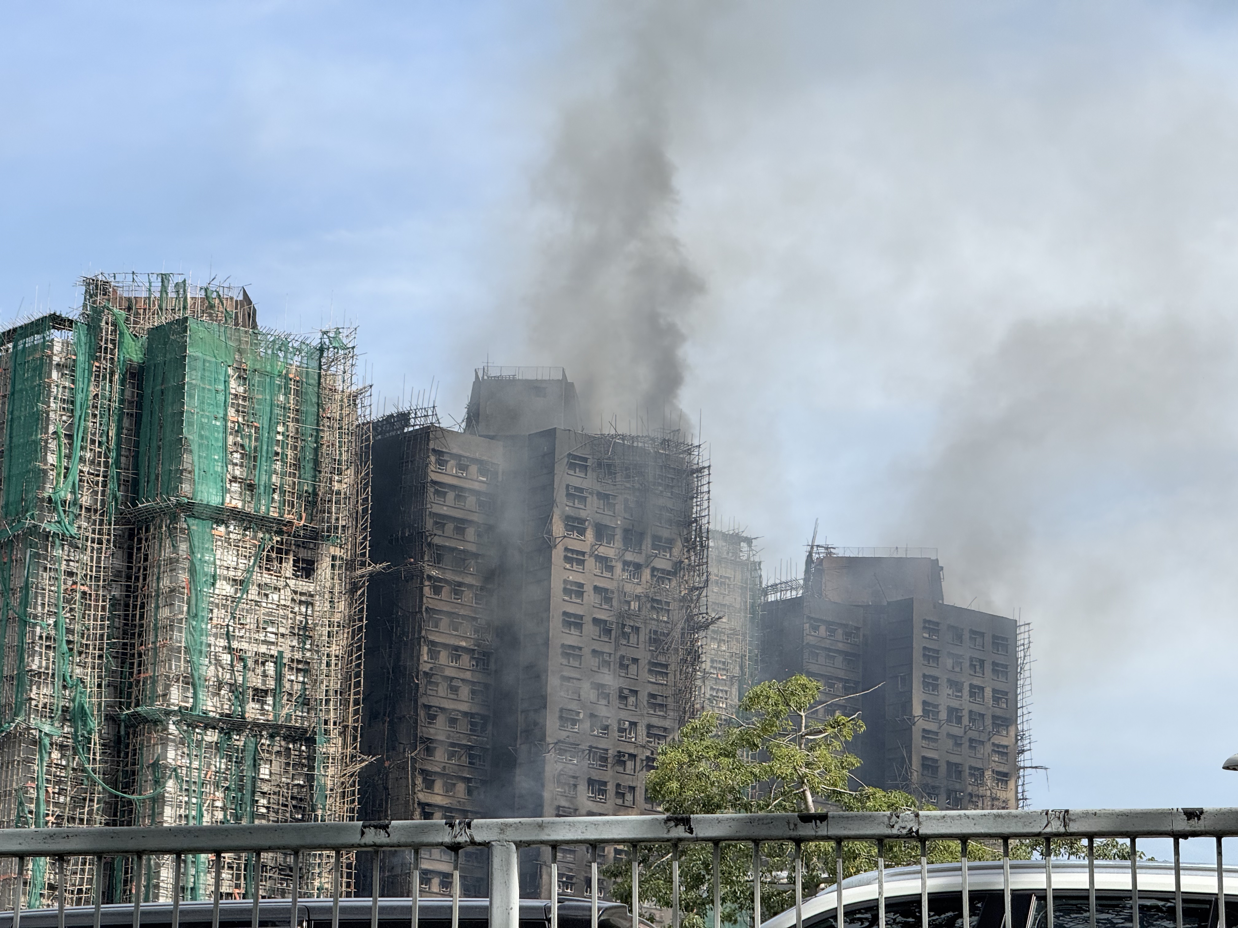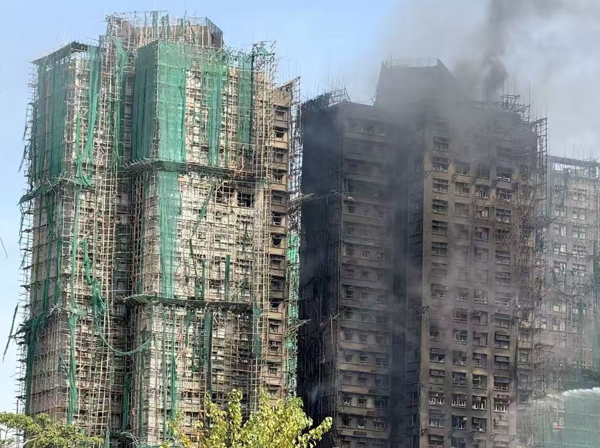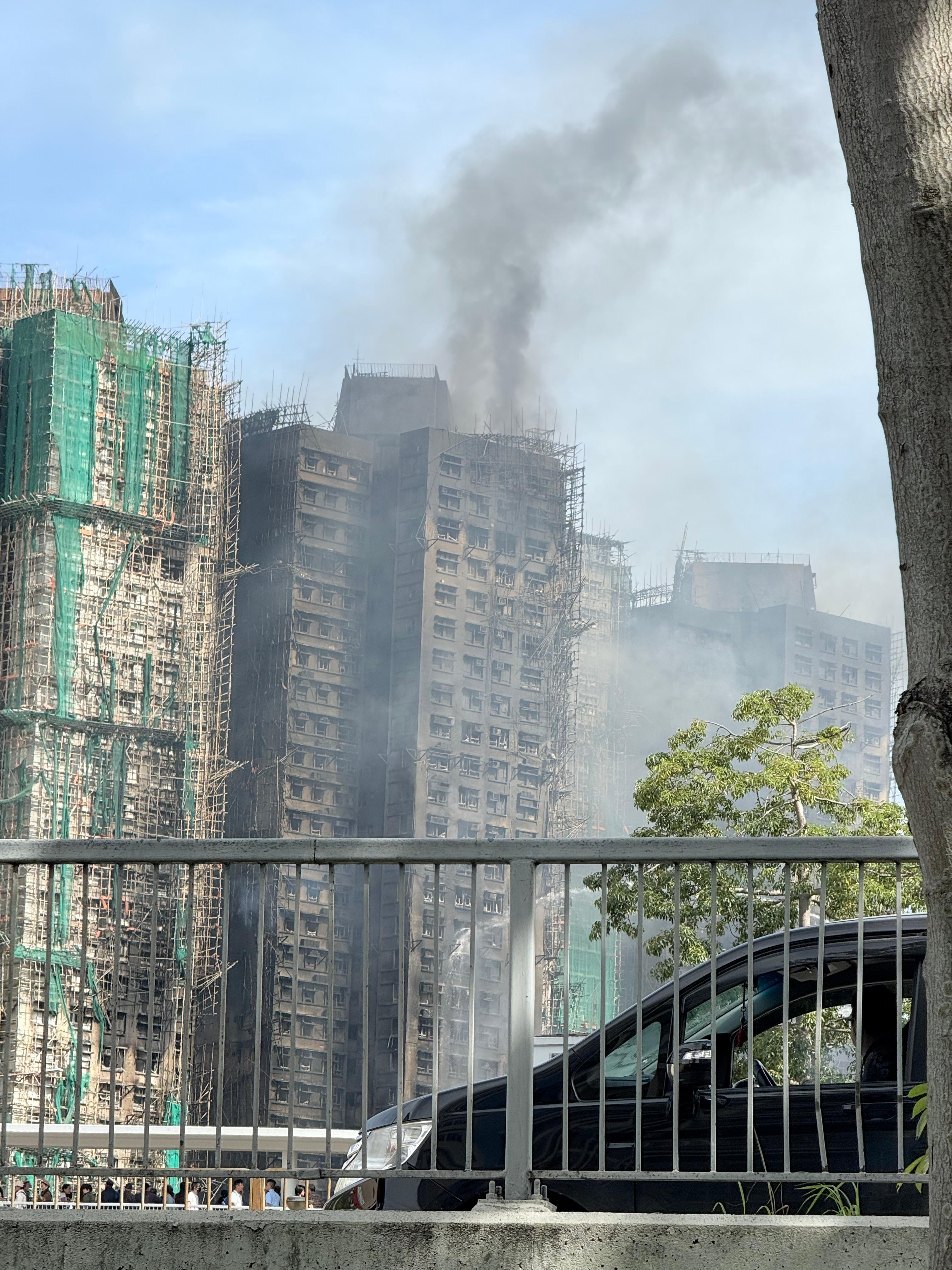 (大公文匯全媒體 記者 劉鴻霖)大埔宏福苑昨日(26日)發生五級火警,造成多人傷亡,消防人員仍在進行滅火行動。事故已增至44人遇難;傷者中有45人情況嚴重,亦有7名消防人員受傷。今日(27日)下午1時許,大公文匯全媒體記者現場可見,火勢還未完全撲滅,宏仁閣中部、宏新閣中上部以及宏泰閣上部仍冒黑煙;宏新閣頂部還有火苗不斷外溢。