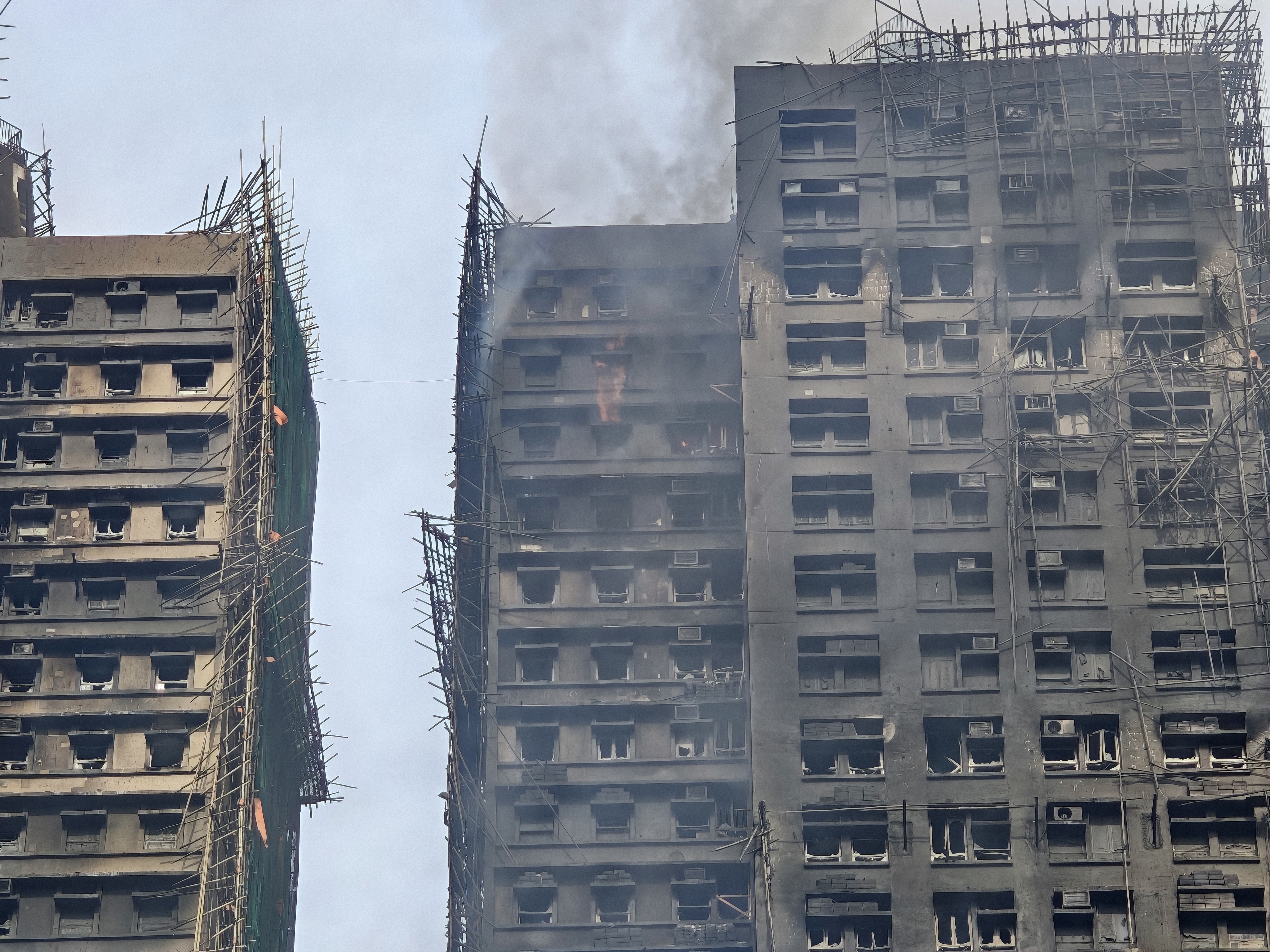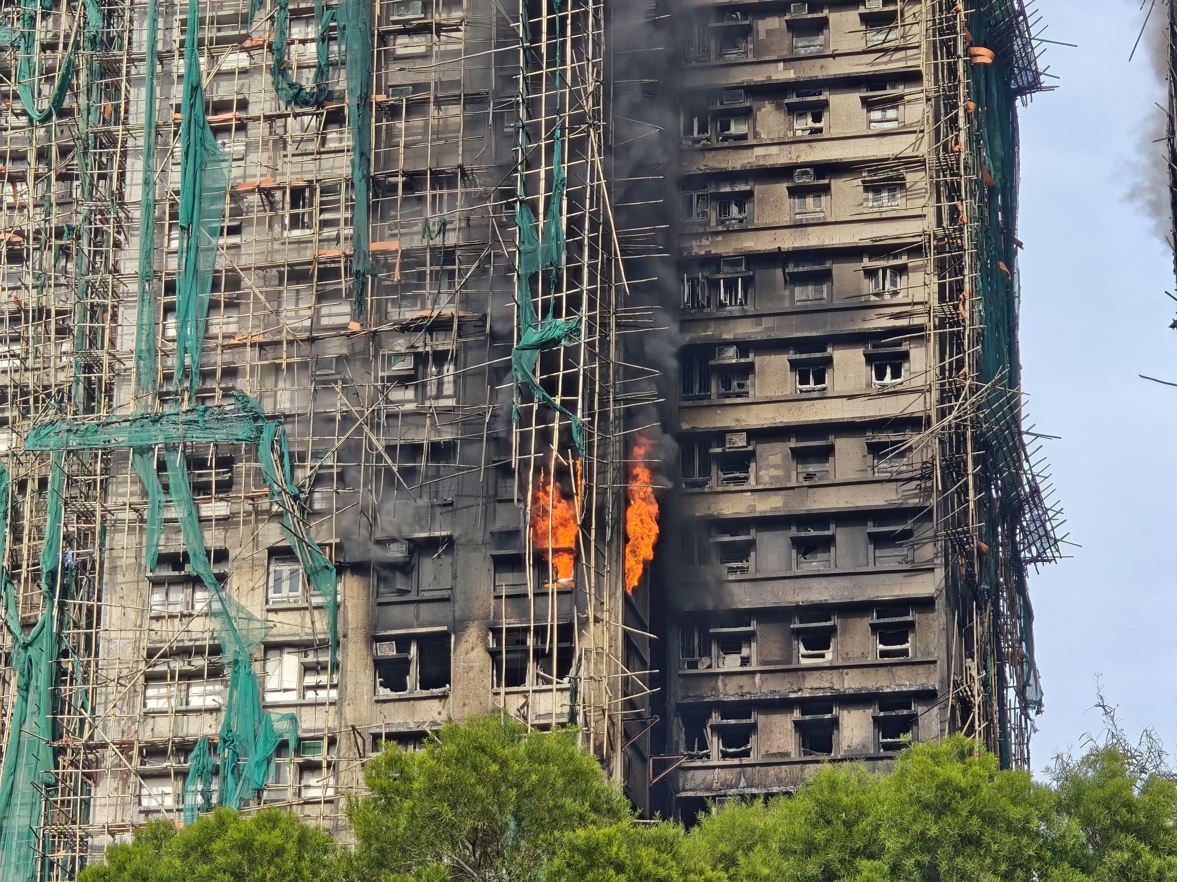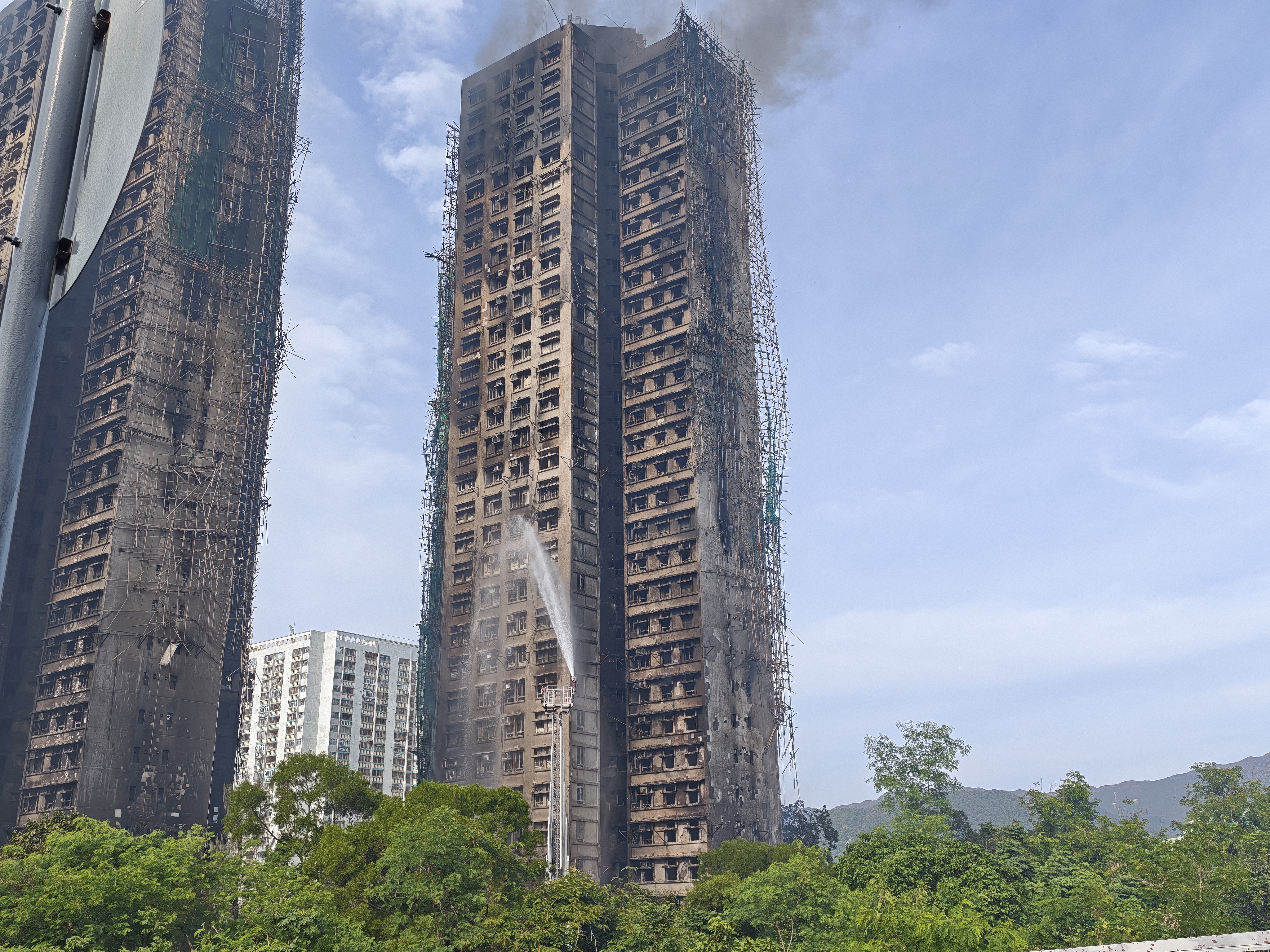 大公文匯全媒體報道,大埔宏福苑昨日(26日)發生五級火警,造成多人傷亡,消防人員仍在進行滅火行動。事故已增至55人遇難;傷者中有45人情況嚴重,亦有7名消防人員受傷。今日(27日)下午3時左右,大公文匯全媒體記者在火災現場見到,火勢還未完全撲滅,原本未見有明顯火跡的宏道閣中部窗口突然冒出火焰,並且火勢有越來越大的趨勢,在燃燒途中記者不時聽到疑似內部傳來的爆裂聲。