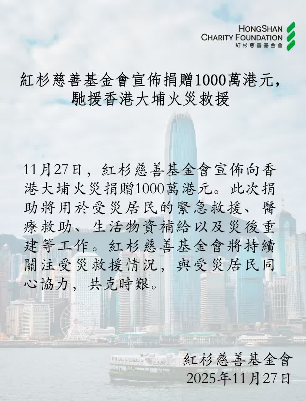 大公文匯網報道,11月27日,紅杉慈善基金會宣布向大埔火災捐贈1000萬港元。此次捐助將用於受災居民的緊急救援、醫療救助、生活物資補給以及災後重建等工作。紅杉慈善基金會表示,將持續關注受災救援情況,與受災居民同心協力,共克時艱。