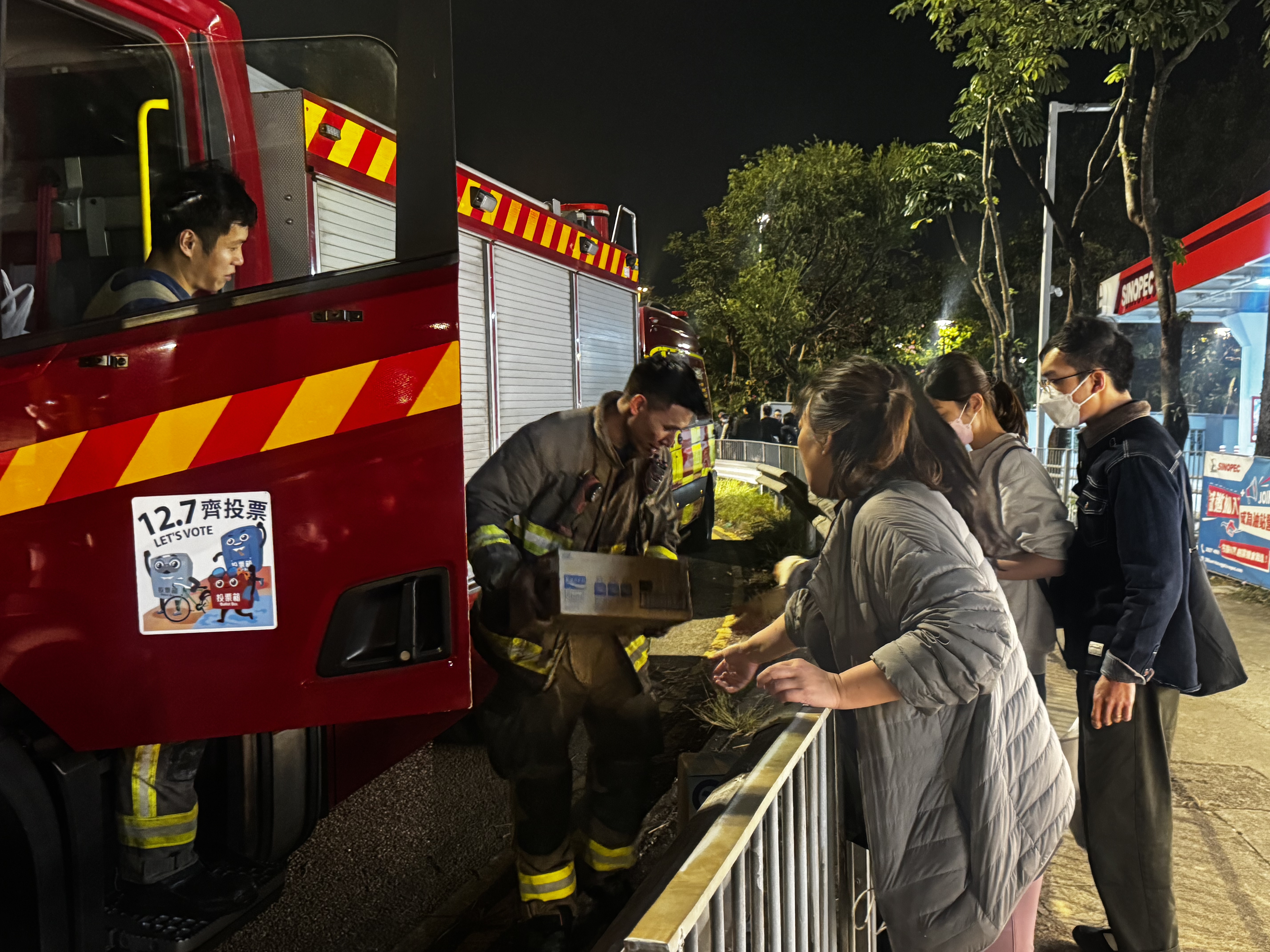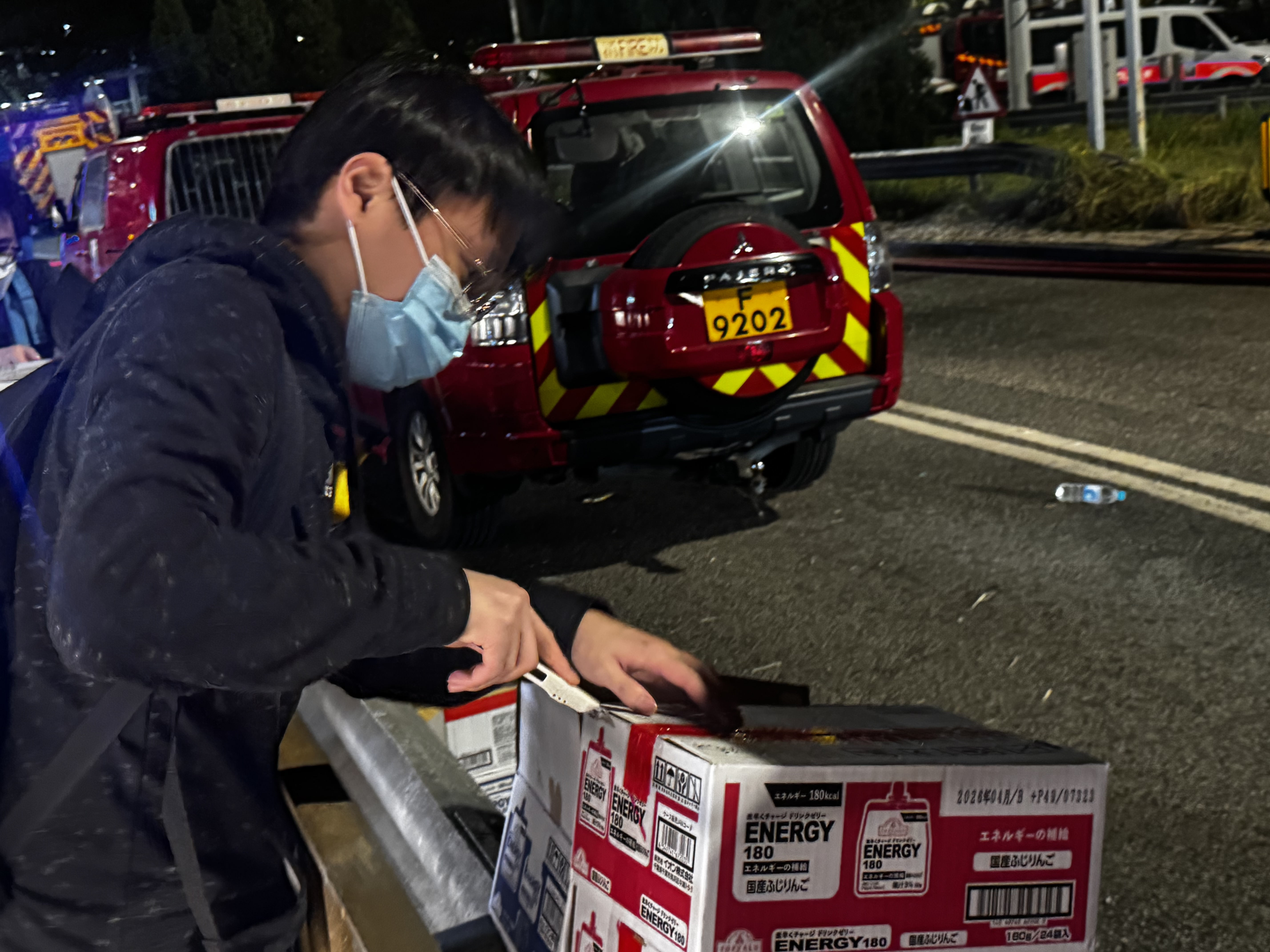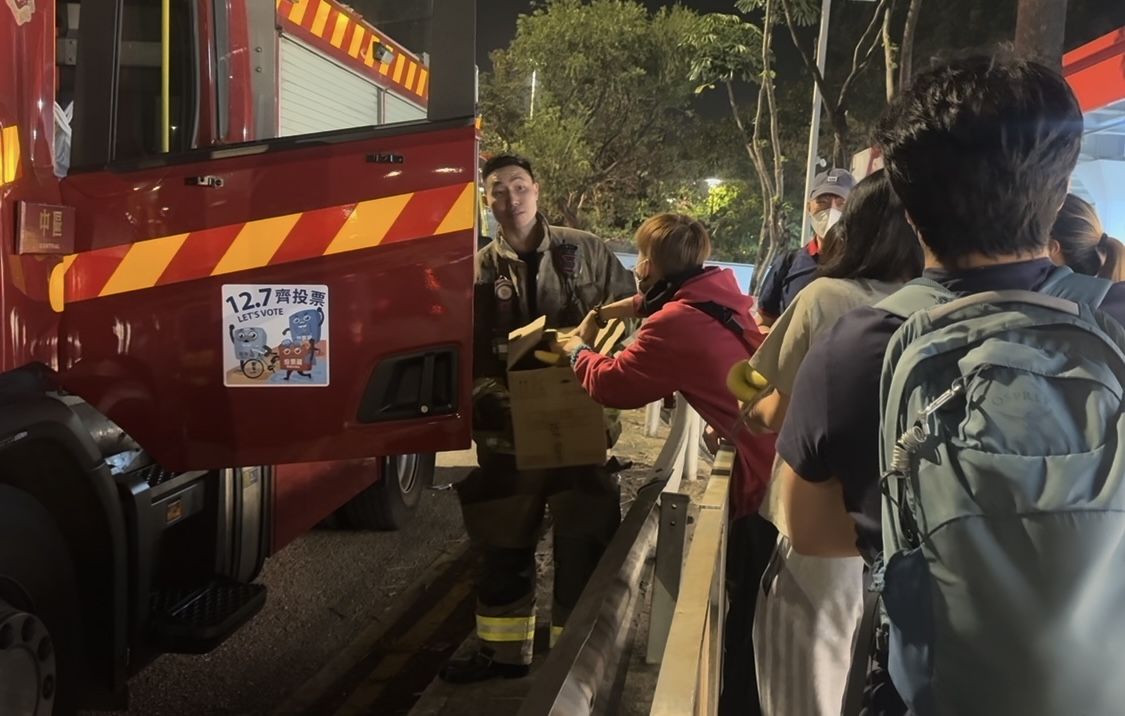 (大公文匯全媒體記者周傾芫報道)今晚(27日),在宏福苑五級火災救援現場,出現一幕動人場景。十幾名市民帶着救援物資前往火災現場,將溫暖直接傳遞給守在一線救災的消防人員。
