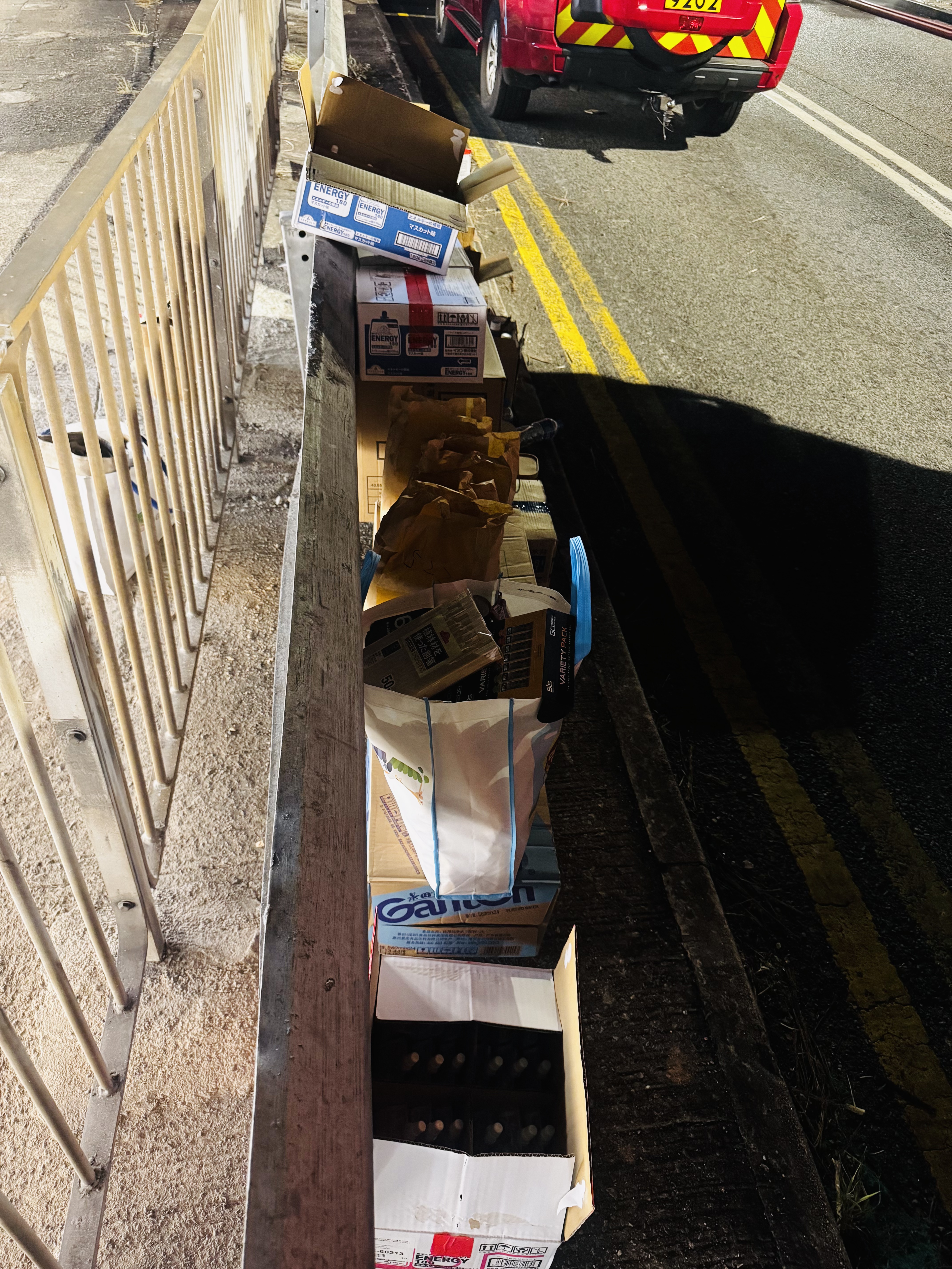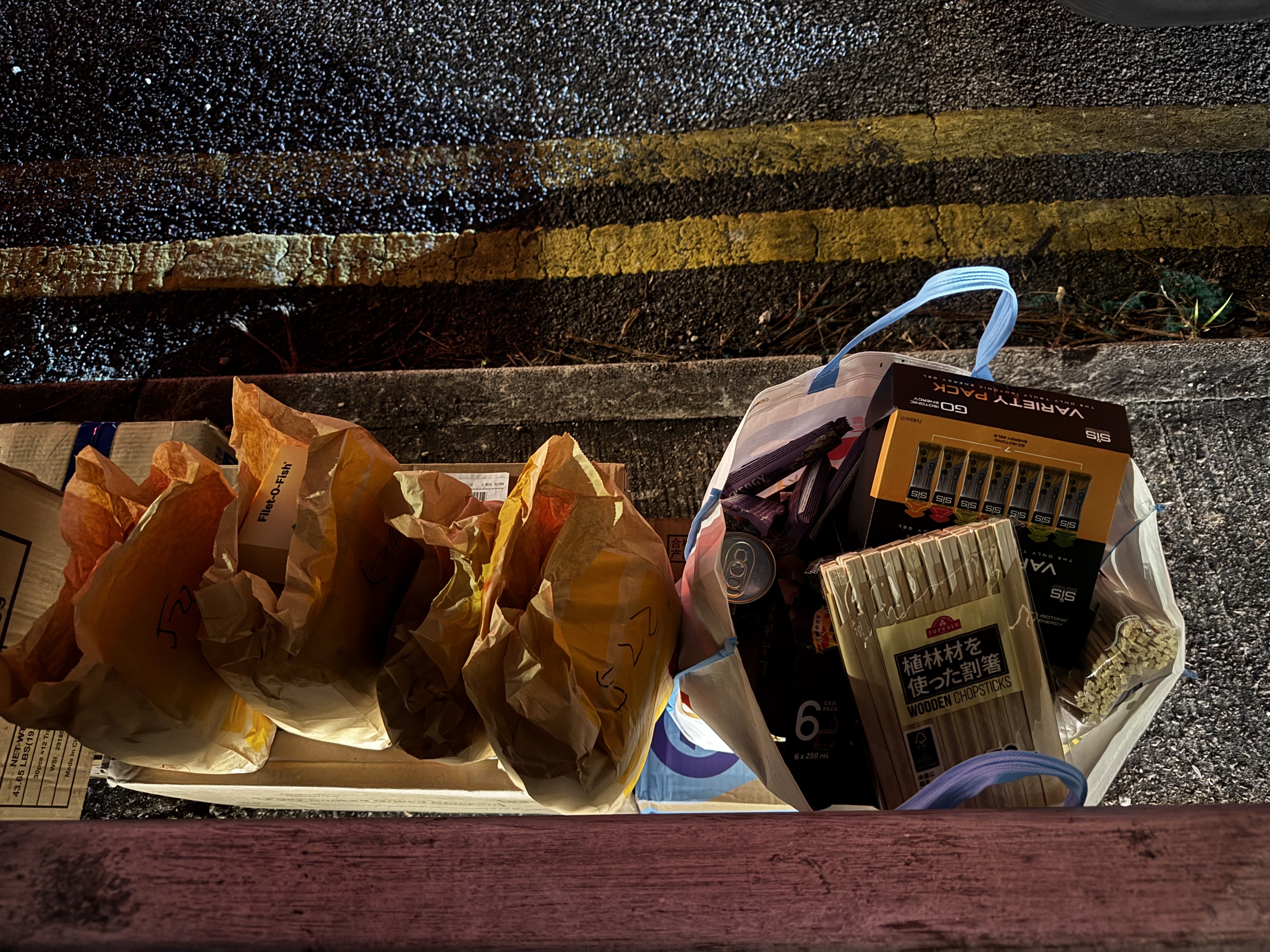 「真的不用這麼多,多謝你哋!」消防隊員看着堆成小山的物資連連道謝,同時建議可將部分物資留置路邊,供後續輪替的同仁取用。大家隨即將成箱礦泉水、能量棒、麥當勞餐點及乾淨餐具整齊排列在路旁,形成一個臨時補給站。