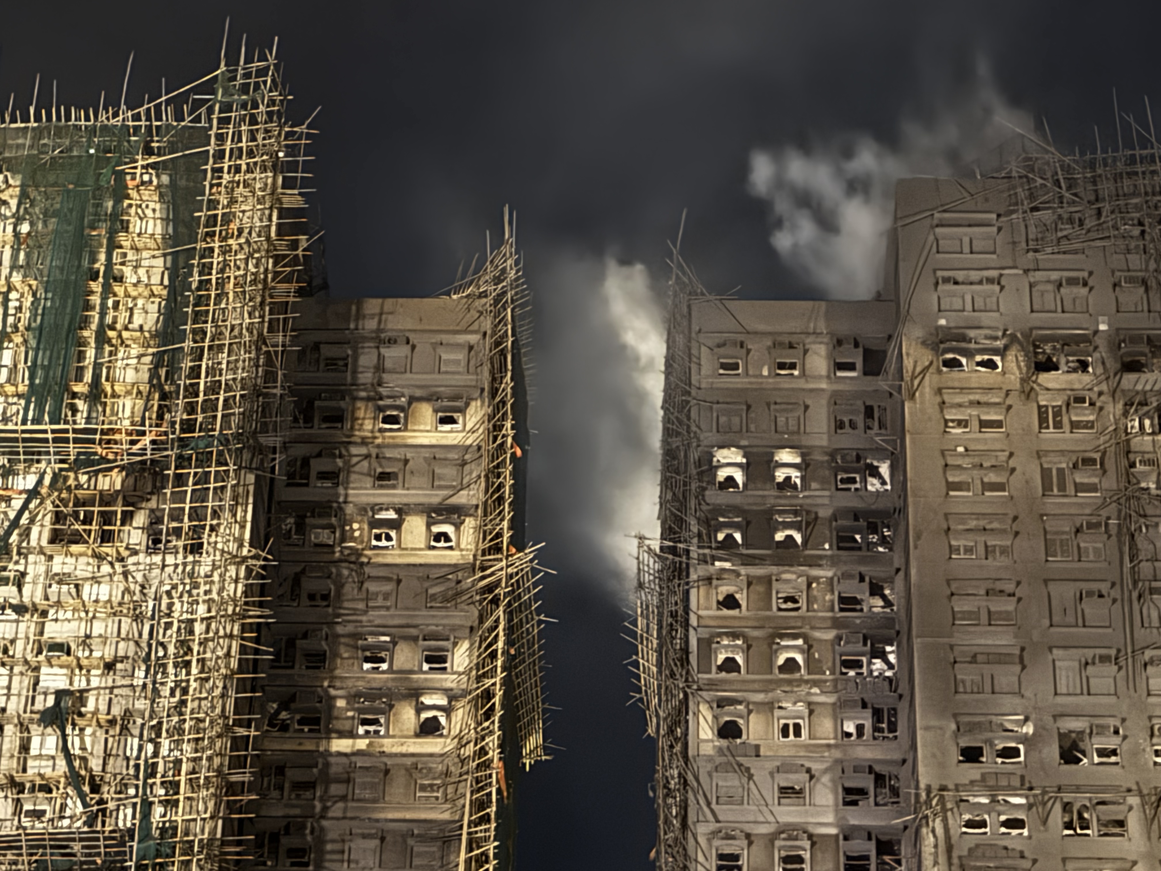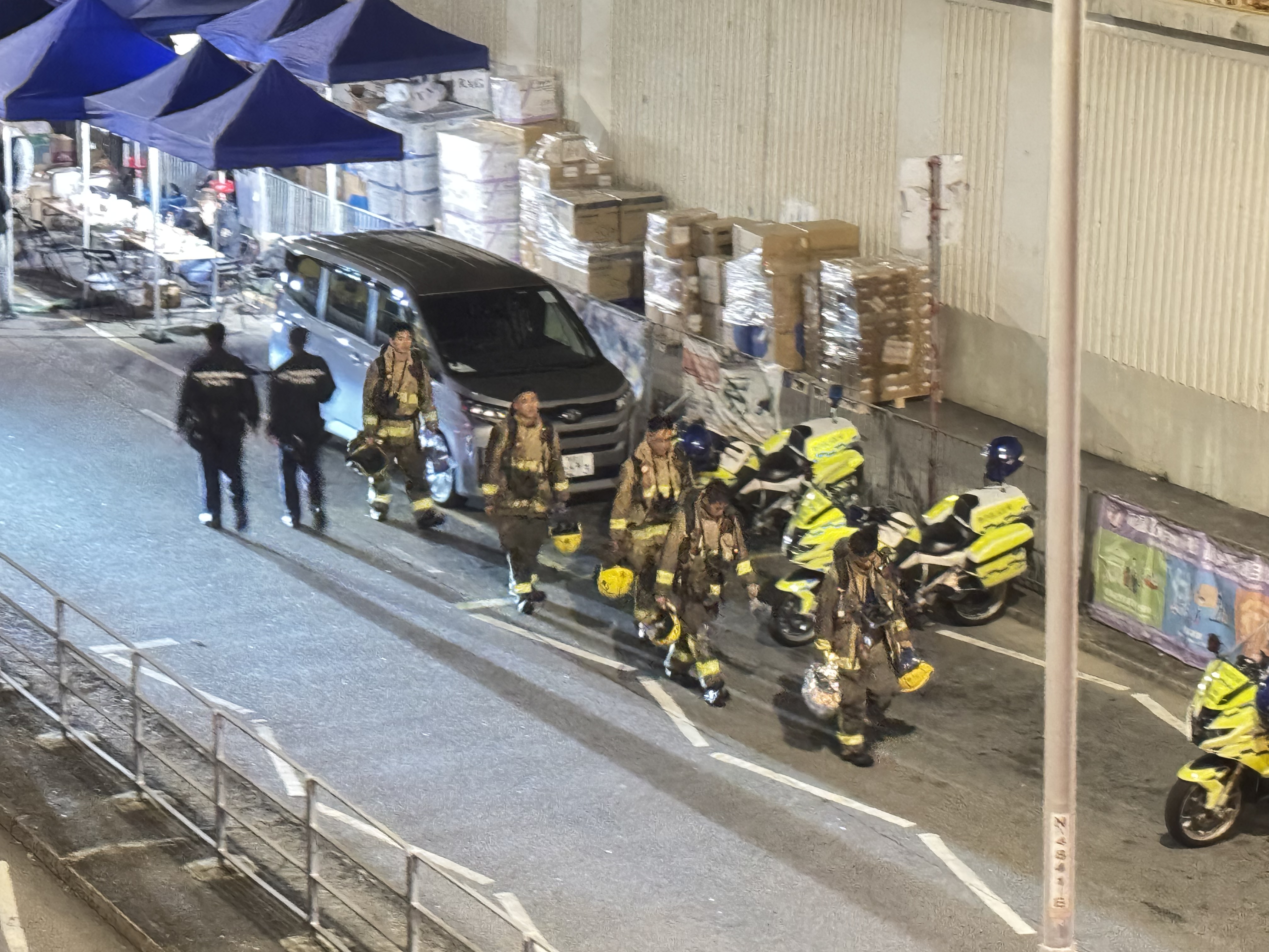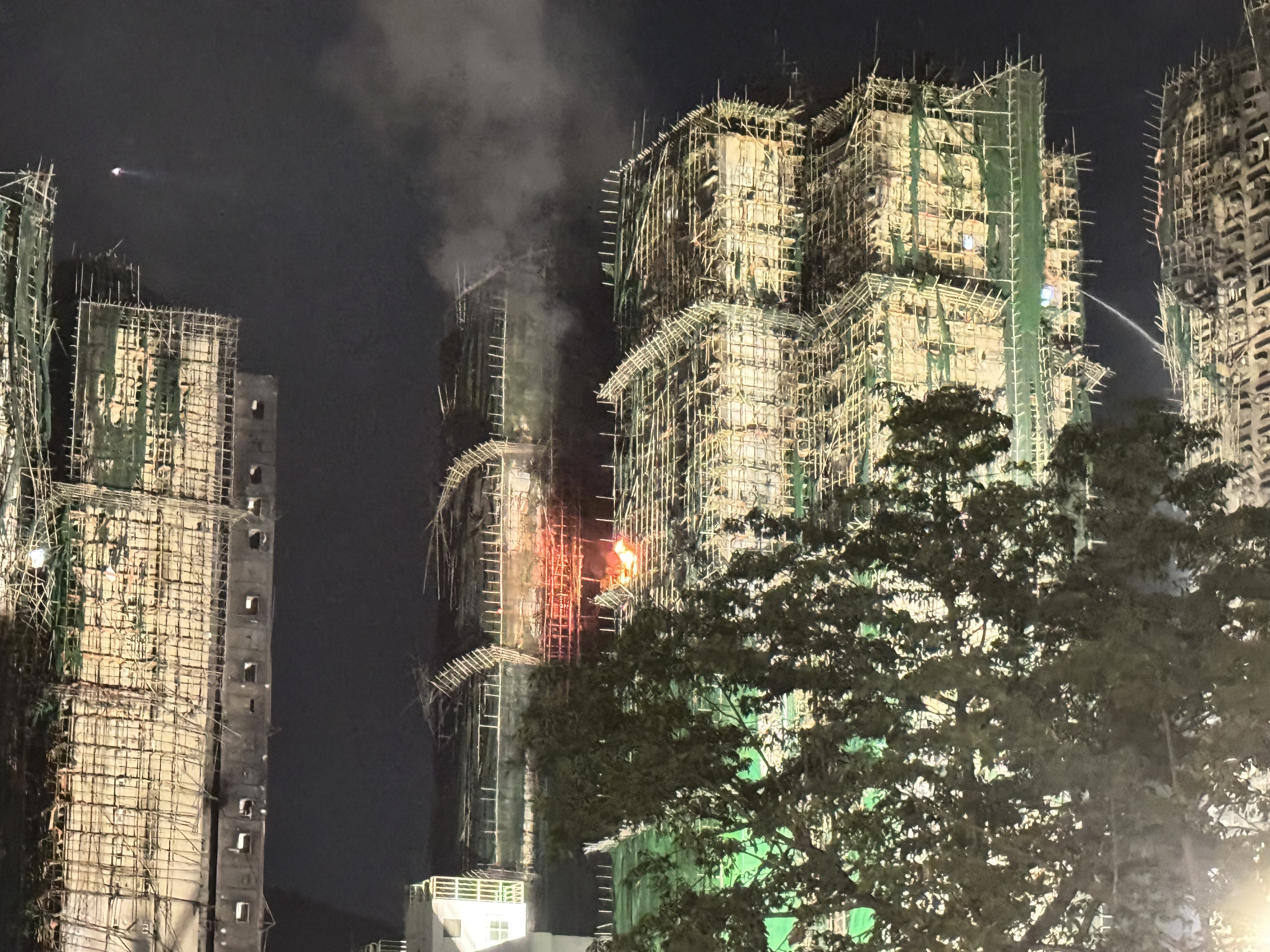 大公文匯全媒體報道,大埔宏福苑昨日(26日)發生五級火警,7座大廈陷入火海,釀成慘重傷亡。大火燒逾24小時,至今日(27日)深夜仍未完全救熄。大公文匯全媒體記者在現場所見,晚上10時,宏泰閣有高層單位仍見明顯火舌,宏新閣亦傳出大量沖天濃煙。消防員堅守一線,不斷進入大廈單位內搜救,爭分奪秒尋找生還者。
