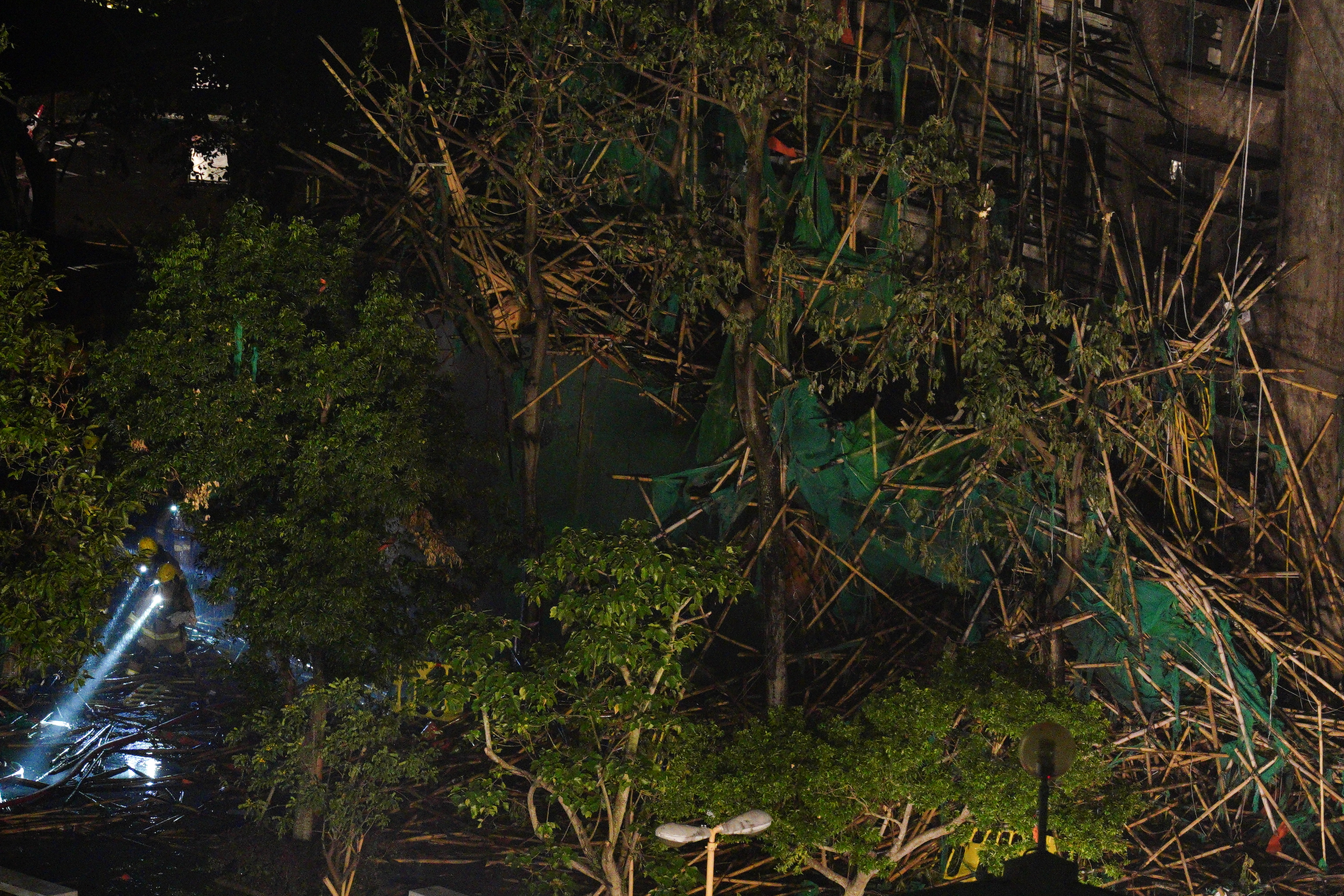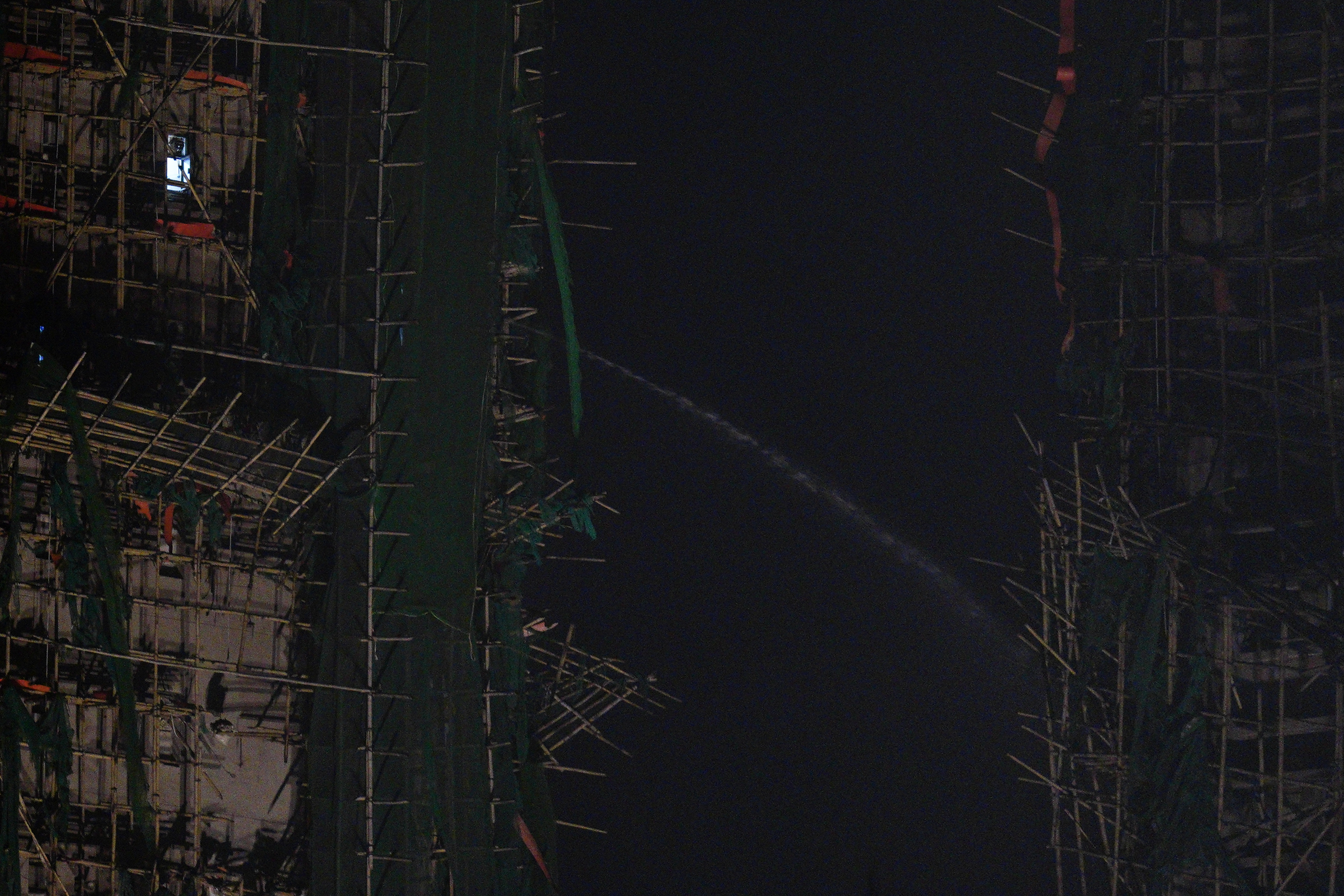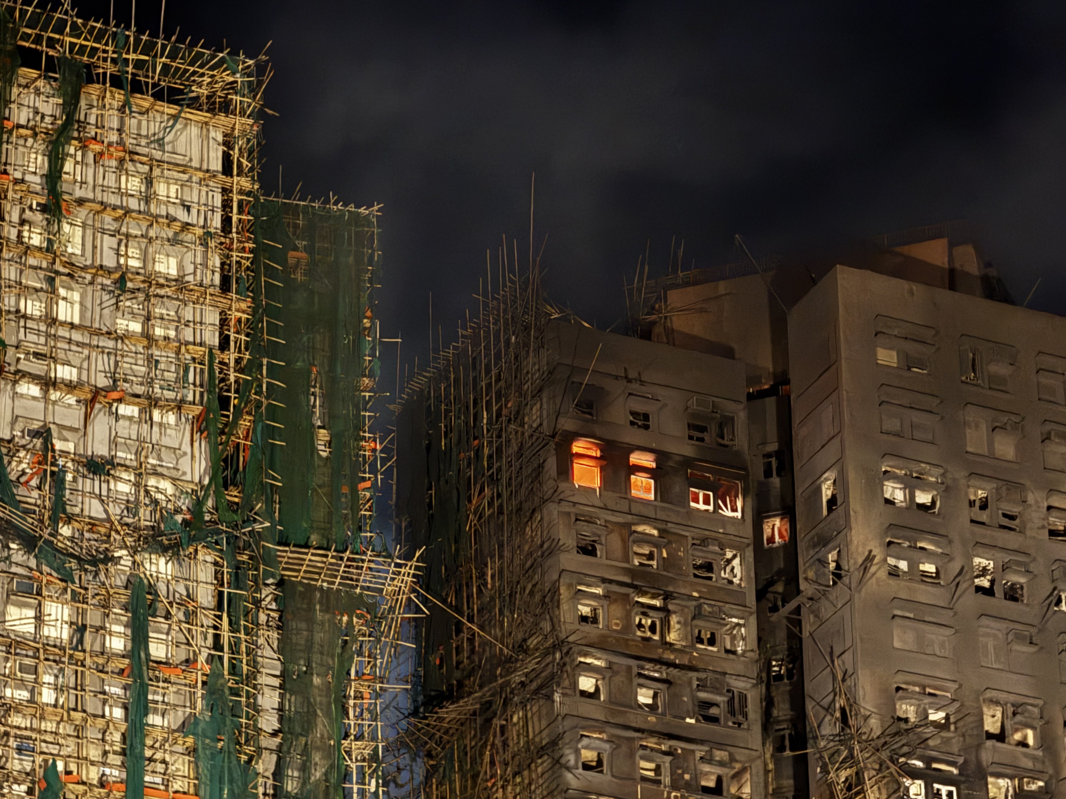 大公文匯全媒體報道,大埔宏福苑昨日(26日)發生五級火警,7座大廈陷入火海,釀成慘重傷亡。大火燒逾24小時,至今日(27日)深夜仍未完全救熄。大公文匯全媒體記者在現場所見,晚上10時,宏泰閣有高層單位仍見明顯火舌,宏新閣亦傳出大量沖天濃煙。消防員堅守一線,不斷進入大廈單位內搜救,爭分奪秒尋找生還者。