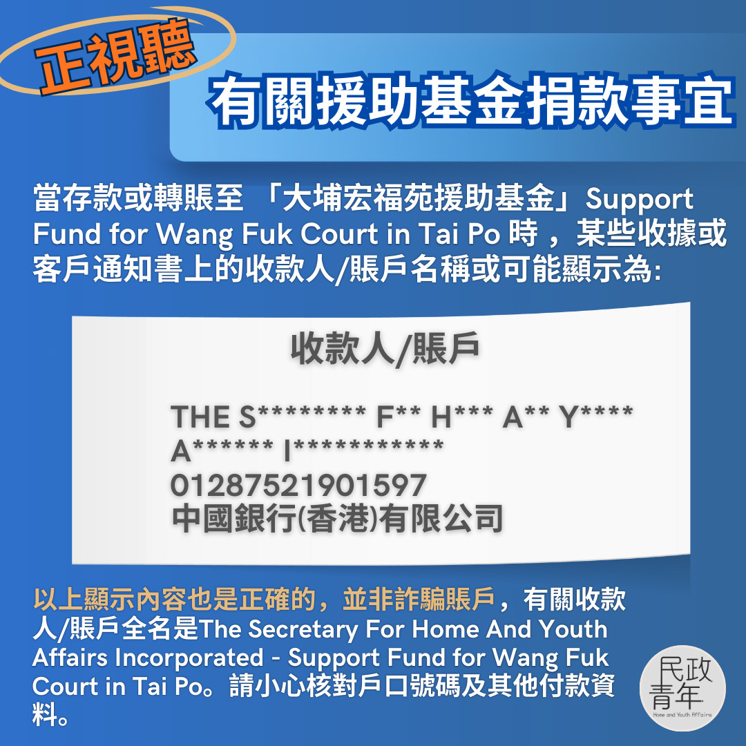 另外,民青局收到不少查詢,有些熱心人捐款時於網上捐款時會看到戶口名稱為「The S** H* Y* A* I*」或者「T* S** H* Y* A* I**」,與基金的英文名「Support Fund for Wang Fuk Court in Tai Po」不一致,擔心是詐騙賬號。其實,基金戶口全寫為「The Secretary for Home And Youth Affairs Incorporated - Support Fund for Wang Fuk Court in Tai Po」。 因此所顯示的內容是正確的。