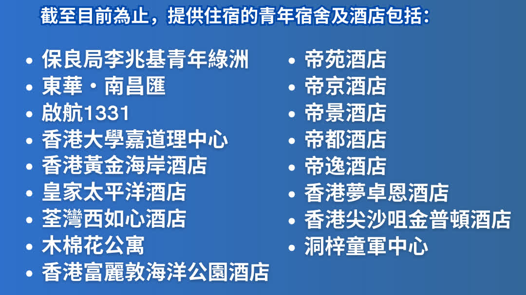 為照顧受大埔宏福苑五級火災影響居民的應急住宿安排,截至目前為止,民青局已透過不同的私營機構和慈善團體,物色到接近1 000個位於青年宿舍及單位作即時緩衝安排。 非常感謝不同機構、集團提供位於包括下列青年宿舍或酒店在內的單位,讓受影響居民能夠即時留宿起碼一至兩個星期。民青局和民政署的團隊會謹守崗位,協助大埔宏福苑的居民渡過艱難時刻。再次感謝社區上的熱心人在受影響居民感到徬徨時提供協助,與大家共渡時艱! 「大埔宏福苑援助基金 Support Fund for Wang Fuk Court in Tai Po」 中國銀行(香港)銀行戶口 港元:012-875-2-190159-7 人民幣及其他貨幣:012-875-2-190160-7