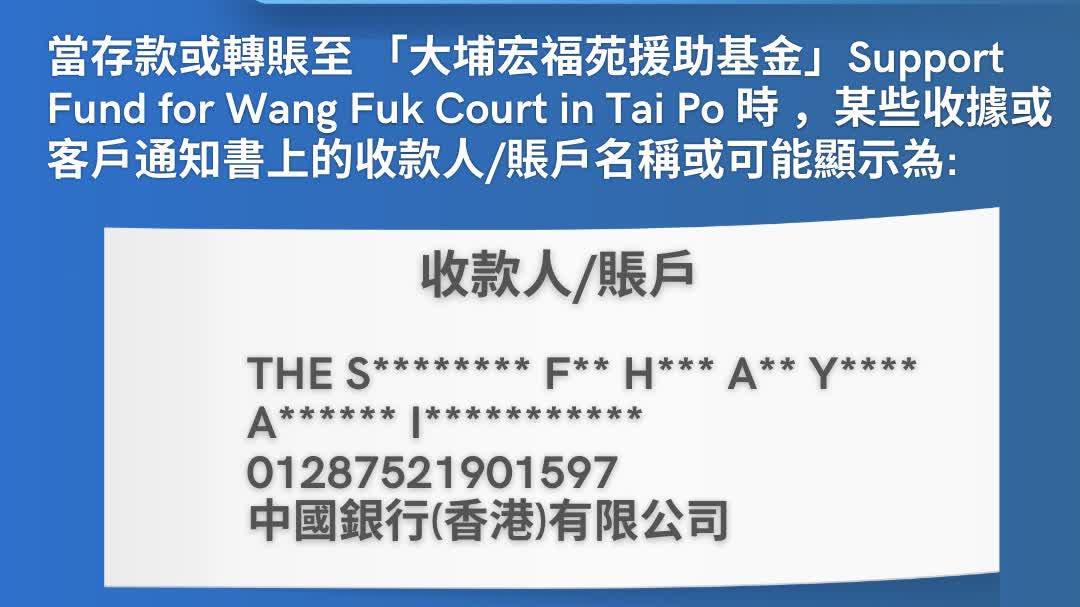 大家只需要填妥收款人為「Support Fund for Wang Fuk Court in Tai Po」, 以及核對清楚戶口號碼無誤,即使有些朋友會看到戶口前面有「The S** H* Y* A* I*」 或者 「T* S** H* Y* A* I**」 的部分,仍可以正確捐贈到援助基金。